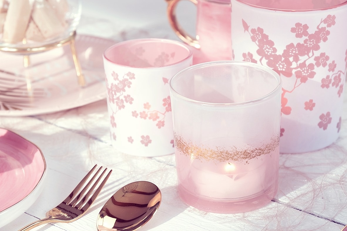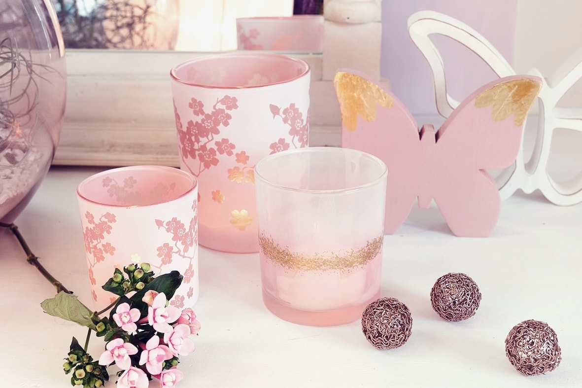 Deko-Tipp: Als romantische Begleiter für unsere Kugelvase passen diese Windlichter und Teelichthalter in Rosa einfach perfekt.