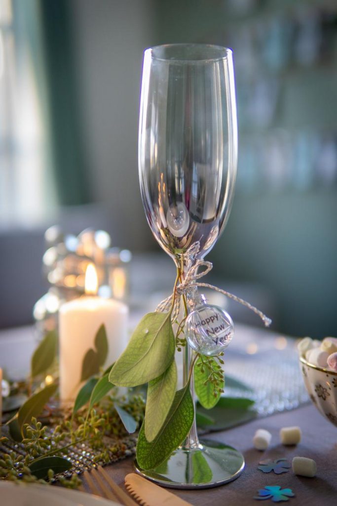 Dafür einfach ein kleinen Eukalypuszweig mit einem Band, wie diesem, um am Stiel festbinden. Wer mag, kann es zu Silvester mit diesen kleinen „Happy New Year“ Kugeln toppen.