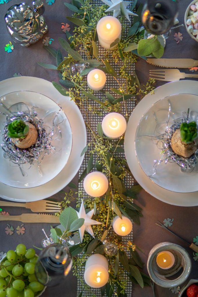 Silvester steht für mich für einen Neuanfang und eine gewisse Leichtigkeit. Diese zwei Gefühle möchte ich auch mit der Dekoration ausdrücken und deshalb bleibe ich bei den Farben Grau, Weiß, Silber und Grün.