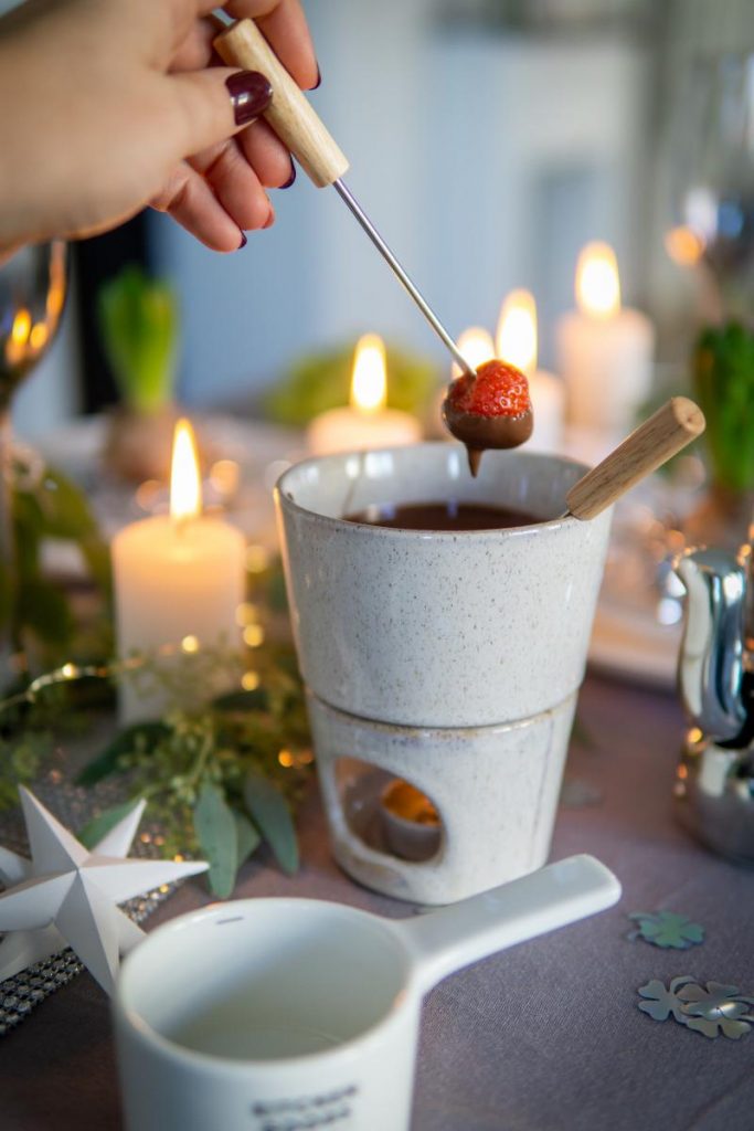 Das Schokoladen-Fondue-Set beinhaltet das Töpfchen für die Schokolade, zwei Spießgabeln mit schönen Holzgriffen und ein Stövchen für ein Teelicht, dass die Schokolade den ganzen Silvesterabend flüssig hält.