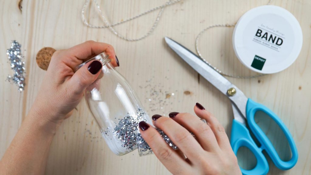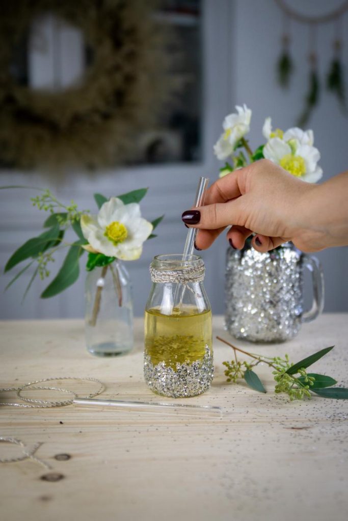 …und wer sagt denn, dass man Sekt nur aus Sektgläsern trinken sollte? Wir haben noch kleine „Milchflaschen“ von Halloween übrig gehabt und diese habe ich im Nu mit etwas Glitzer und Kleber silvestertauglich gemacht.