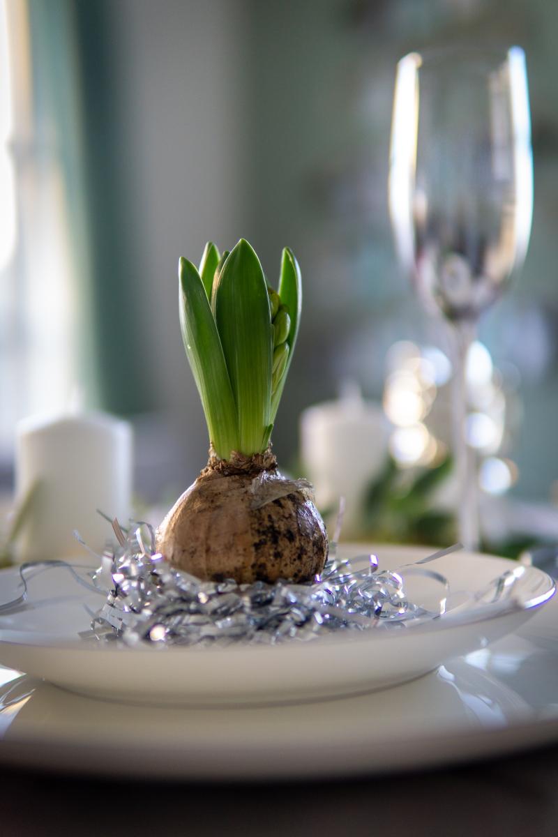 Die oben erwähnte Frische und Leichtigkeit bringen wir mit kleinen Hyazinthen im Lametta-Nest auf den Tisch. Dafür einfach aus dem Lametta ein Ring formen und in die Mitte die Hyazinthe setzen.