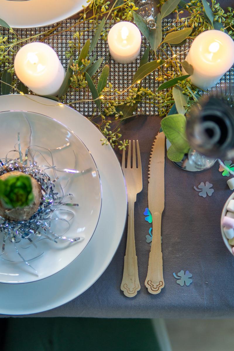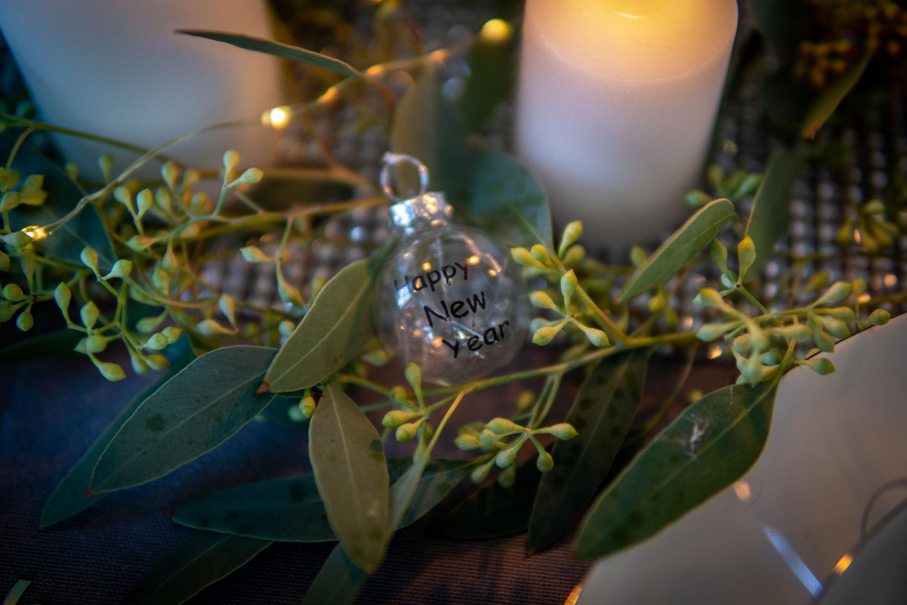 Dafür einfach ein kleinen Eukalypuszweig mit einem Band, wie diesem, um am Stiel festbinden. Wer mag, kann es zu Silvester mit diesen kleinen „Happy New Year“ Kugeln toppen.
