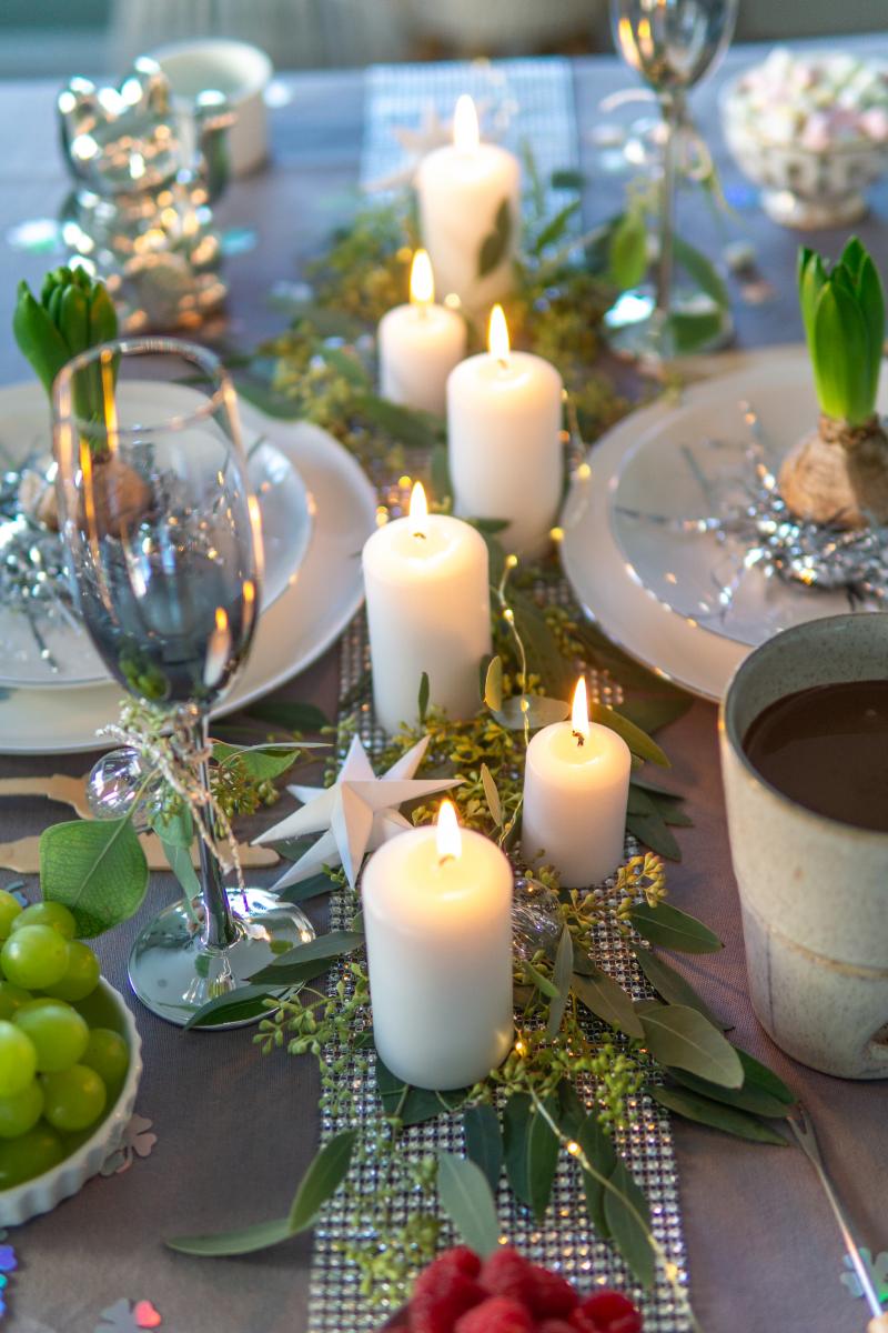 Silvester steht für mich für einen Neuanfang und eine gewisse Leichtigkeit. Diese zwei Gefühle möchte ich auch mit der Dekoration ausdrücken und deshalb bleibe ich bei den Farben Grau, Weiß, Silber und Grün.