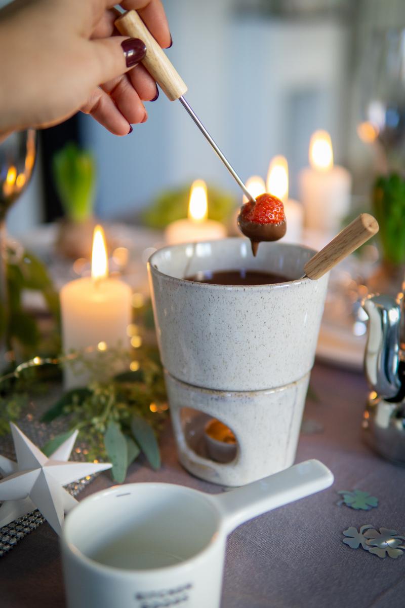 Das Schokoladen-Fondue-Set beinhaltet das Töpfchen für die Schokolade, zwei Spießgabeln mit schönen Holzgriffen und ein Stövchen für ein Teelicht, dass die Schokolade den ganzen Silvesterabend flüssig hält.