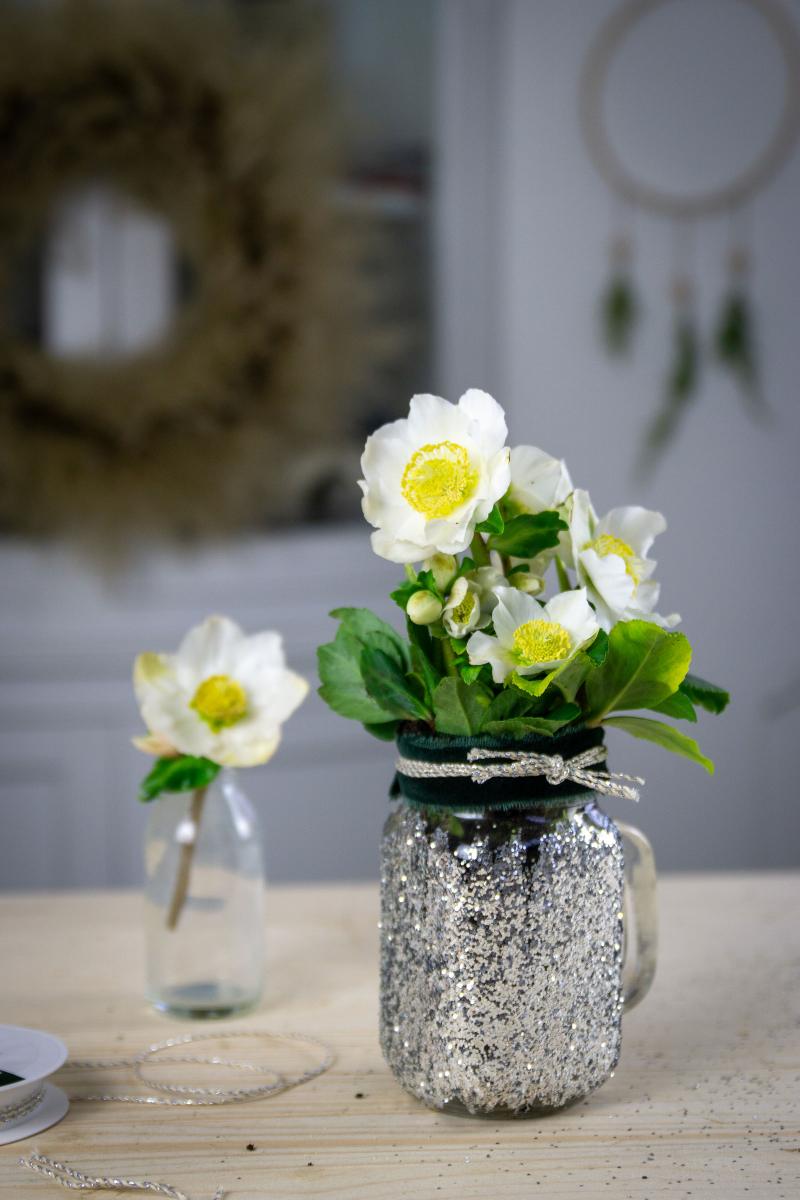 Da ich gerade schon am Hantieren war, ist noch ein kleines Geschenk für meine Mama in einem Henkelglas entstanden. Statt den üblichen Kleepflanzen habe allerdings eine Christrose genommen. Diese kann man später in einem Blumentopf oder in den Garten auspflanzen.