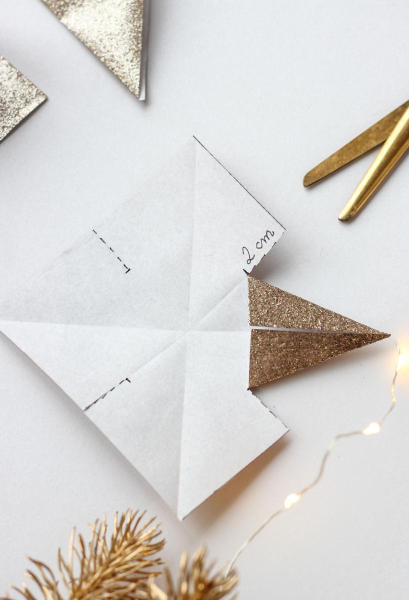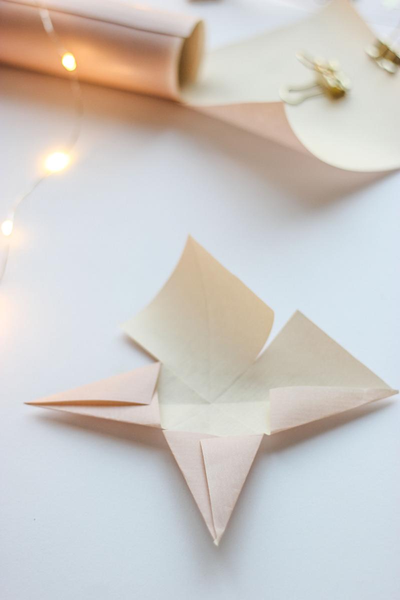 - So sollten vier Zacken entstehen, die durch das überlappende Aufeinanderkleben dreidimensional werden. Dies geht mit doppelseitigen Klebeband genauso wie mit Kleber.