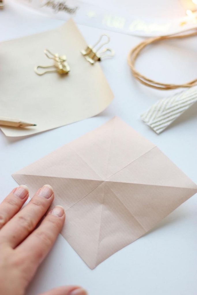 - Die gegenüberliegenden Ecken zueinander falten, sodass weitere zwei Faltlinien jeweils diagonal entstehen.