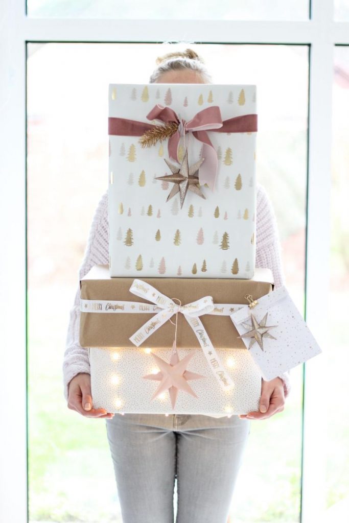 Zudem habe ich eigentlich immer einfarbiges Papier (hier rosa Packpapier) im Haus, denn es ist einfach ein super Allrounder und kann beliebig gestyled werden. Auch dieses wird mit einem dicken Stift und den Worten „merry xmas“ schnell zum Weihnachtspapier.