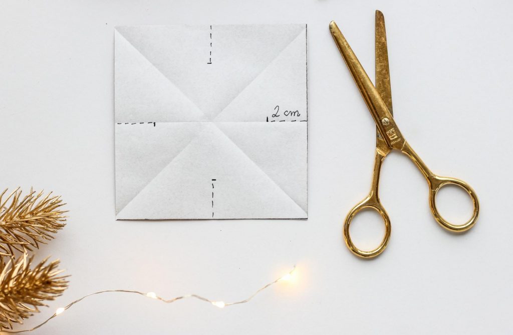 - Vom Einschnitt aus werden jetzt die Zacken gefaltet, indem das Papier auf die aus der Ecke kommende Linie gefaltet wird.