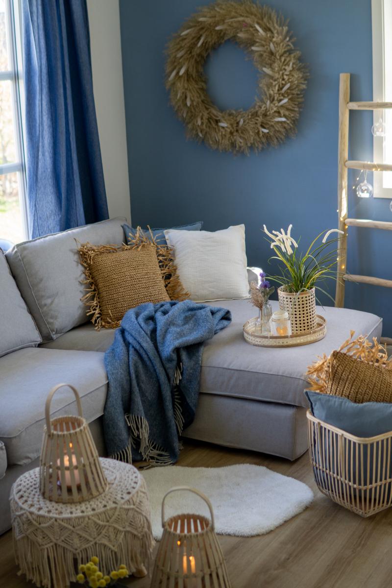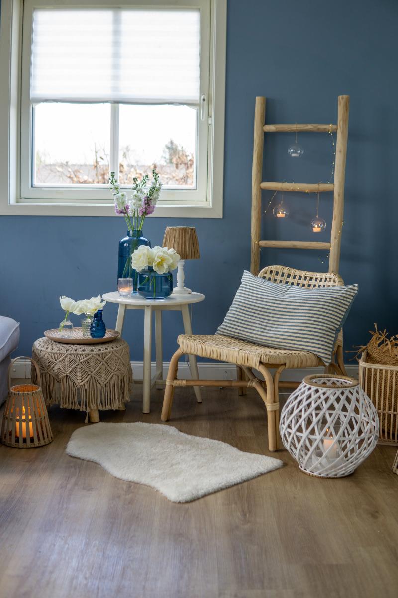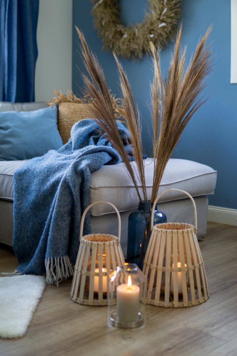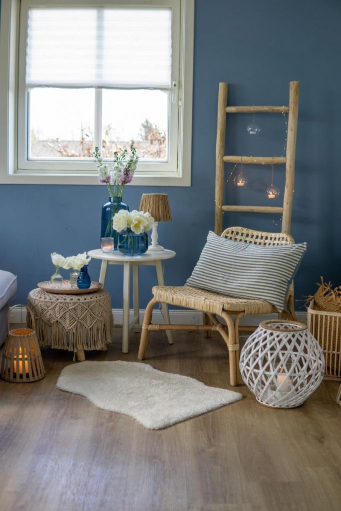 Blautöne lassen sich hervorragend mit hellem Holz und mit Naturtönen kombinieren. Mit ein Paar Kerzen, einer Lichterkette und Kissen schafft man eine gemütliche Stimmung. Bambuslaternen, Schaffell und die „Handtuchleiter“ ergänzen den Look. Dabei ist die „Handtuchleiter“ perfekt um ein paar Hängevasen mit Teelichtern ein Platz zu bieten.