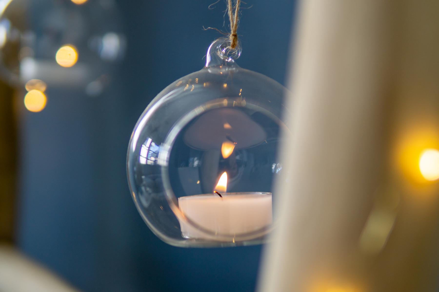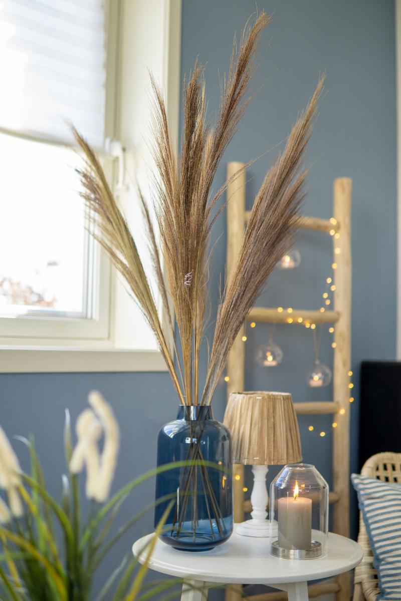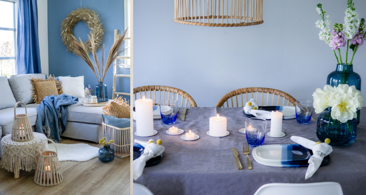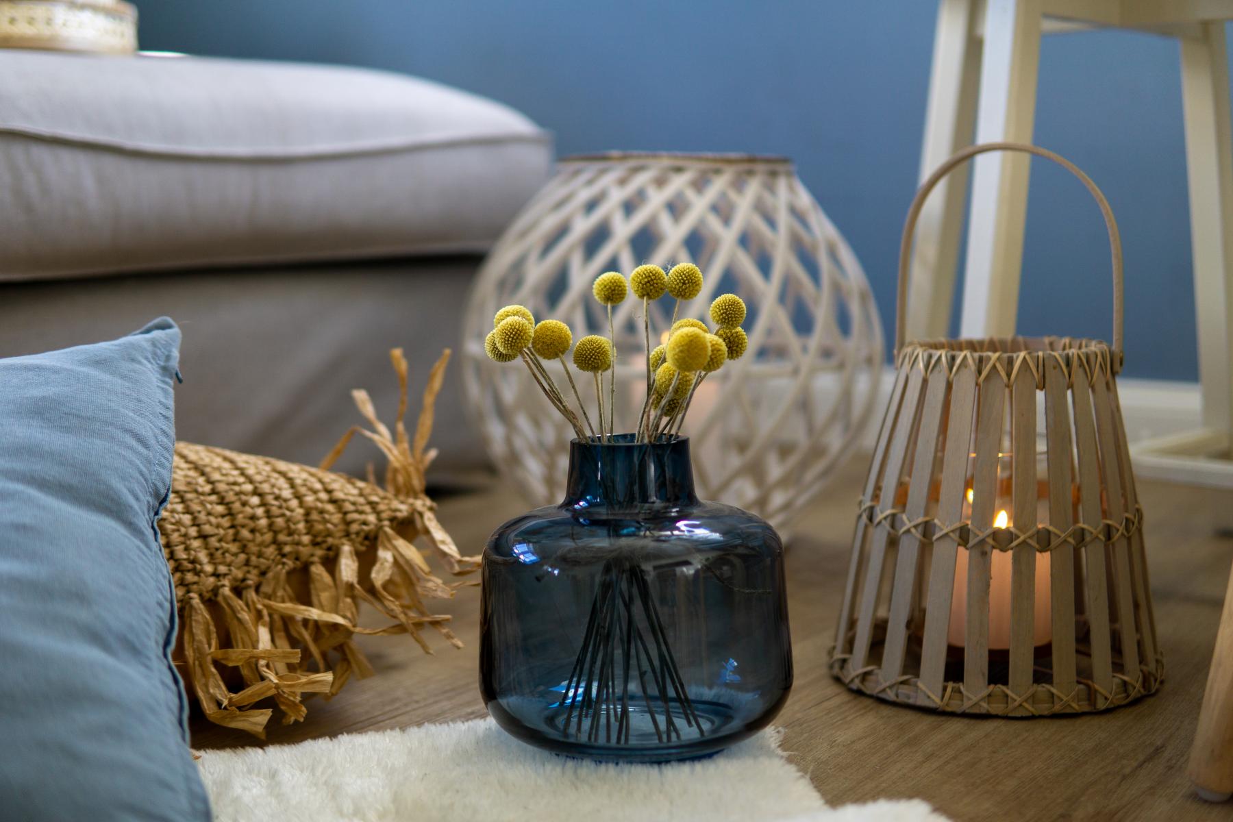 Blautöne lassen sich hervorragend mit hellem Holz und mit Naturtönen kombinieren. Mit ein Paar Kerzen, einer Lichterkette und Kissen schafft man eine gemütliche Stimmung. Bambuslaternen, Schaffell und die „Handtuchleiter“ ergänzen den Look. Dabei ist die „Handtuchleiter“ perfekt um ein paar Hängevasen mit Teelichtern ein Platz zu bieten.