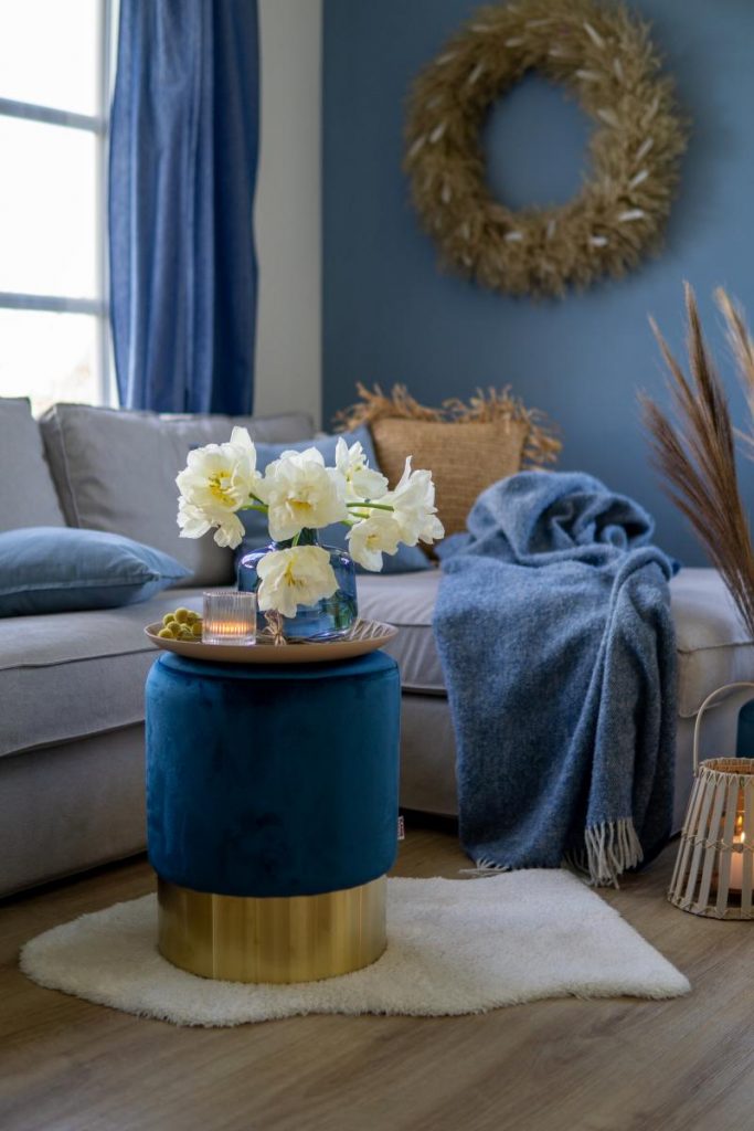 Übrigens: Wer auf den klassischen Beistelltisch verzichten möchte, aber nicht auf dessen Komfort, kann gut einen Hocker verwenden. Entweder passend zum Look im Boho Stil oder man gibt dem Look einen eleganten Touch mit einem blauen Samthocker mit goldenem Absatz. Praktisch und schön.