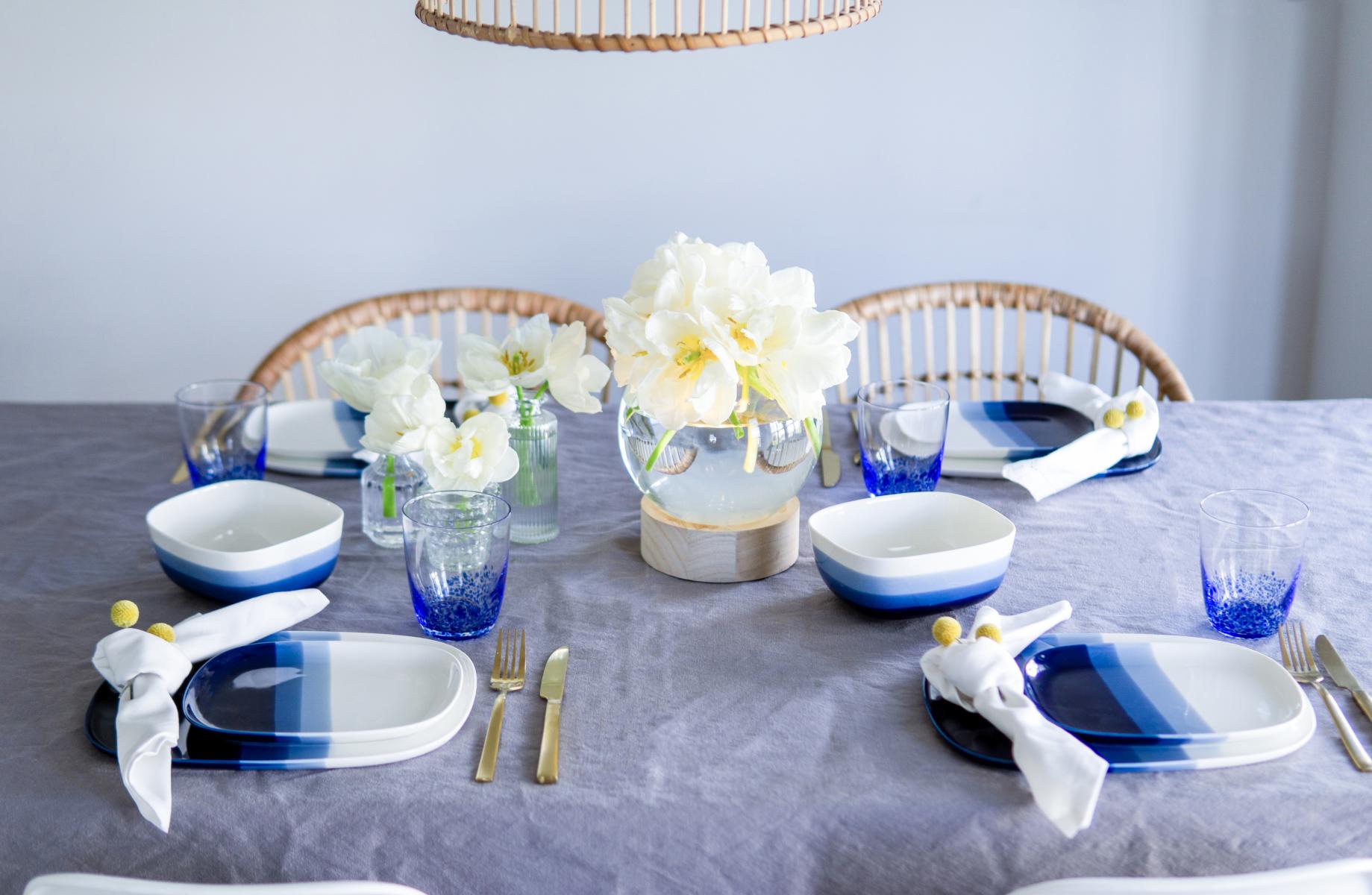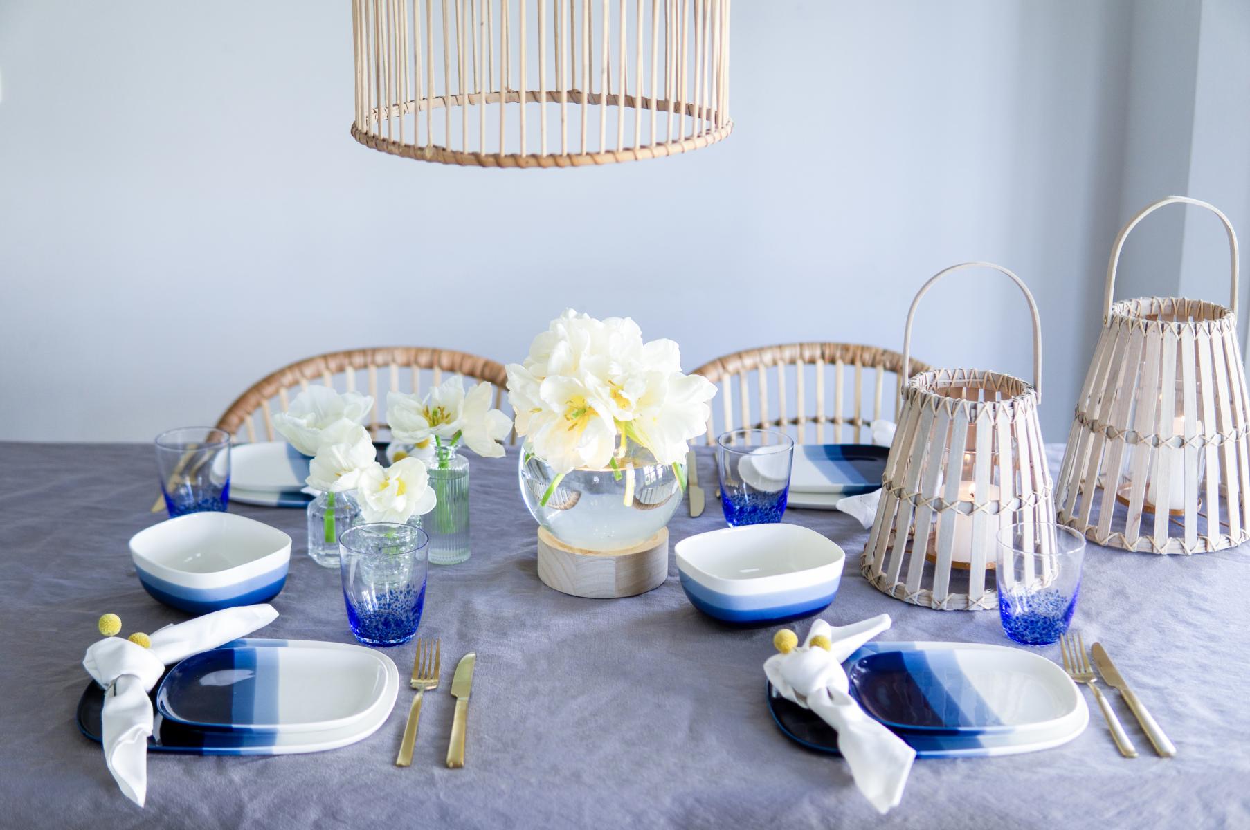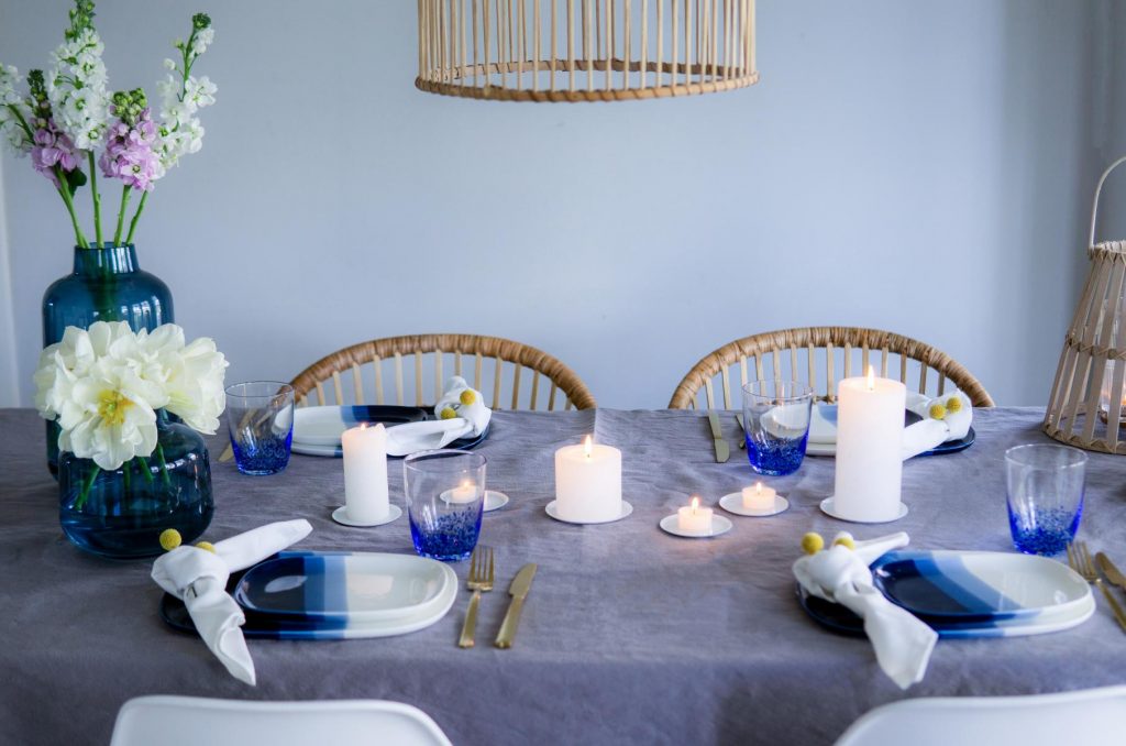 Das blaue Geschirr mit den grafischen Farbblöcken wirkt modern und nicht zu kühl. Die Kerzen bringen die nötige Atmosphäre und die frischen Blumen sind das I-Tüpfelchen.