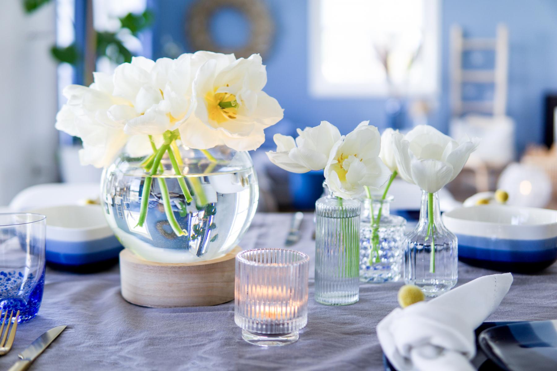 Eine ganz andere Möglichkeit sich am „Classic Blue“ zu erfreuen, ist ein gedeckter Tisch in der Trendfarbe. Hierbei lässt sich das Blau wunderbar mit frischen Blumen kombinieren, aber auch mit Trockenblumen werden die blauen Glasvasen zu einem Hingucker.