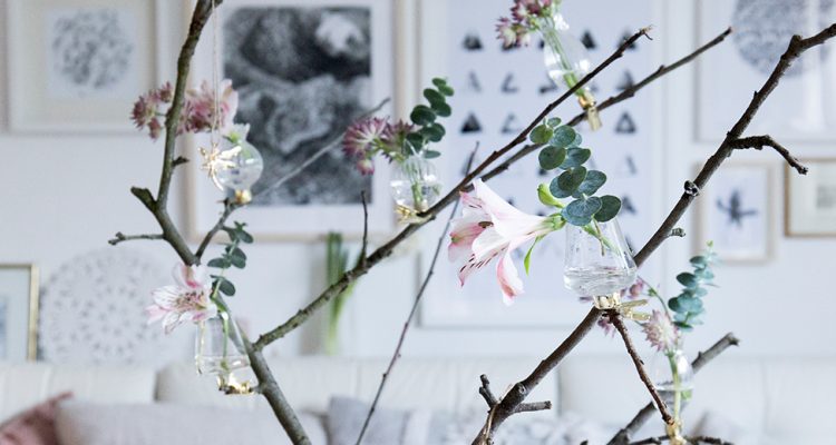 Ein einfacher Ast aus Wald oder Garten wird mit den kleinen Mini-Klemmvasen und ein paar Blumen ruck zuck zur Frühlingsdeko. Blumen wie Astrantia, kleine wilde Lilien und Eukalyptus zieren hier die Mini-Vasen. Als kleine Dekoelemente können noch Anhänger, wie diese Libelle in Gold, an die Äste gehängt werden. Der komplette Ast findet dann seinen Platz in einer großen Vase. Tipp: Hierbei darauf achten, dass die Vase schwer genug ist, da sonst das Deko-Ensemble umfallen könnte. Gegebenenfalls kann die Glasvase auch mit ein paar kleinen Steinen befüllt werden.