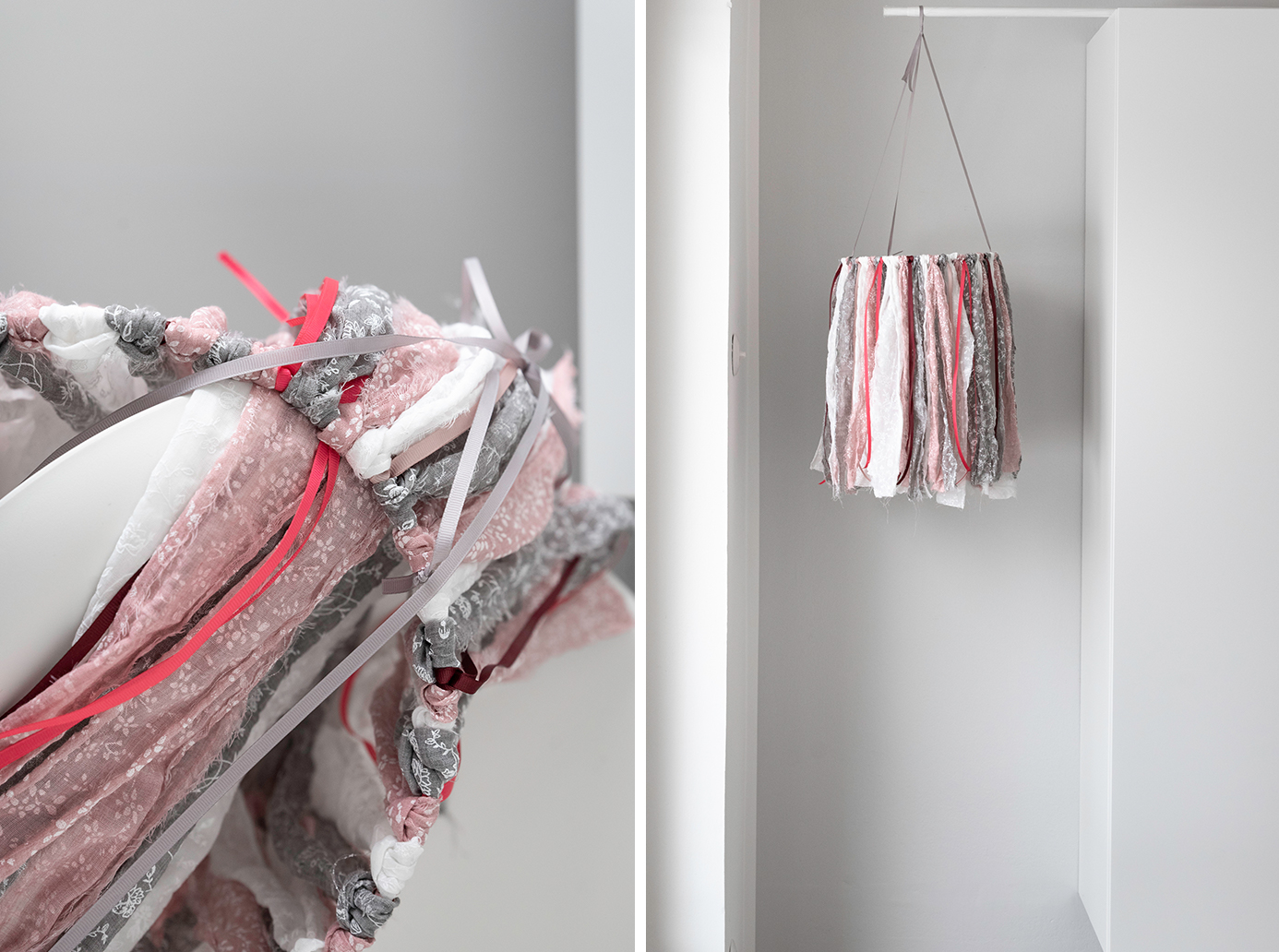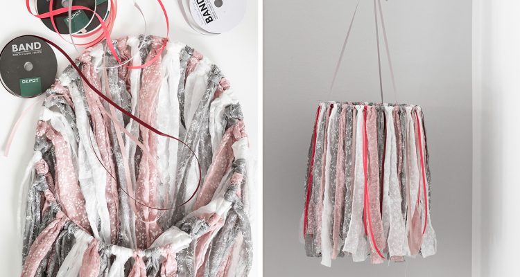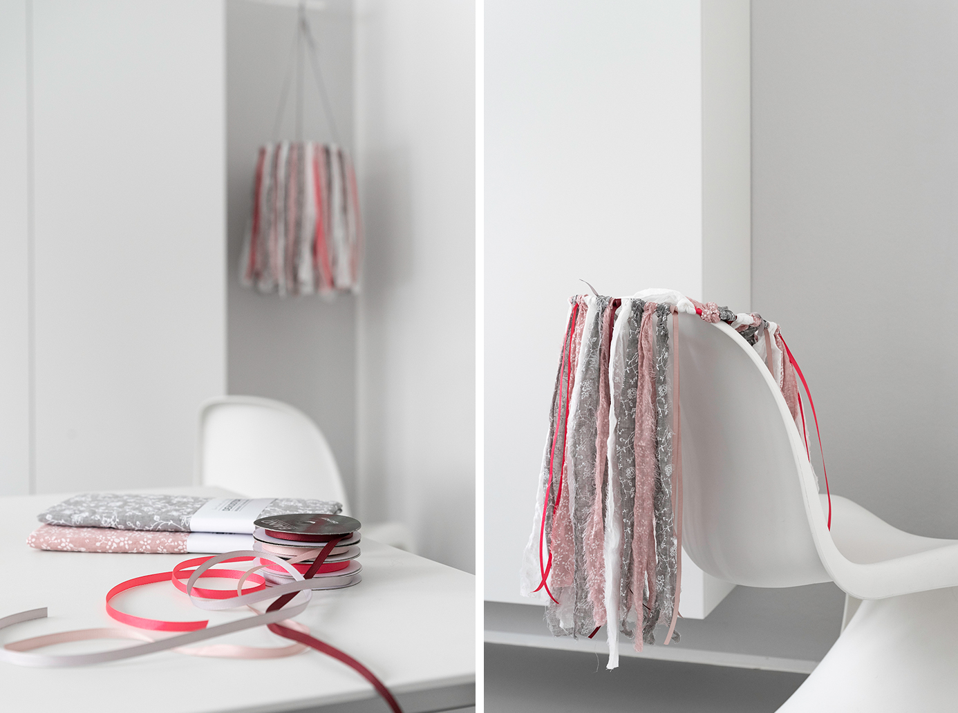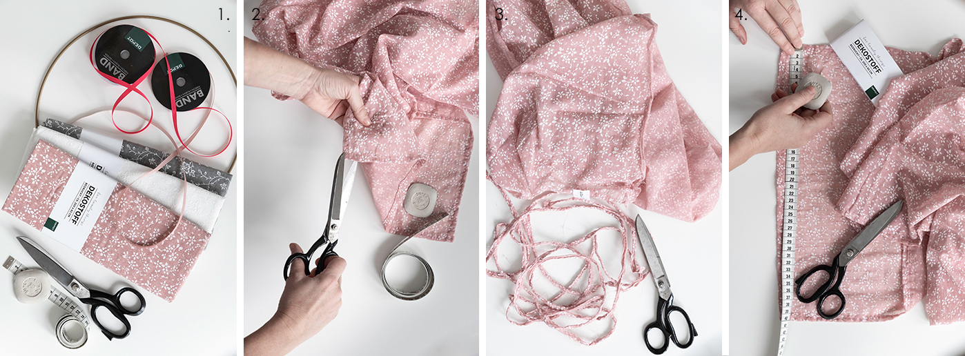 - Wählt passende Stoffe und Dekobänder aus, die zur Farbwelt eurer Wohnung passen. Ich habe mich für Rosa, Weiß und Grau entschieden.