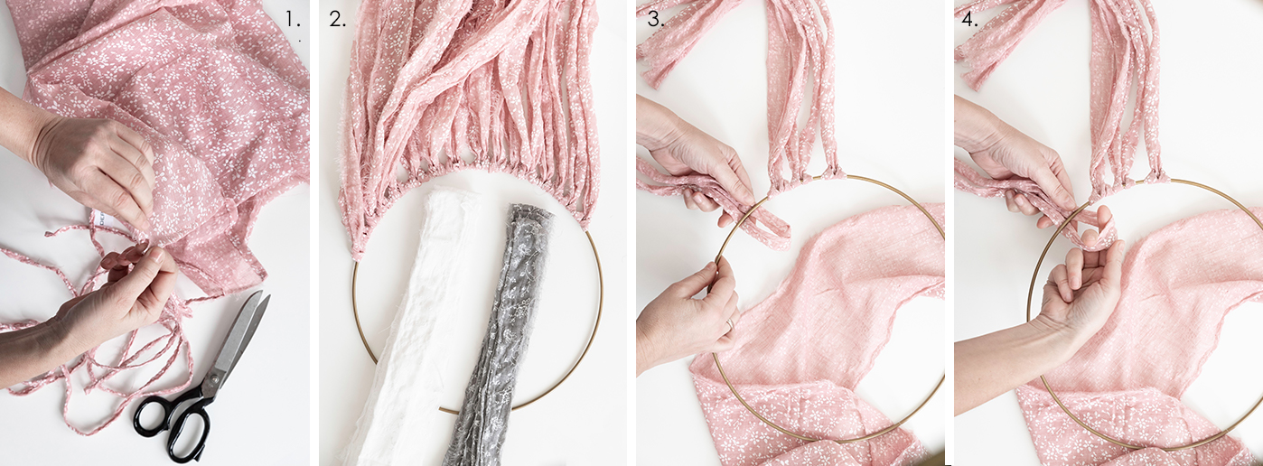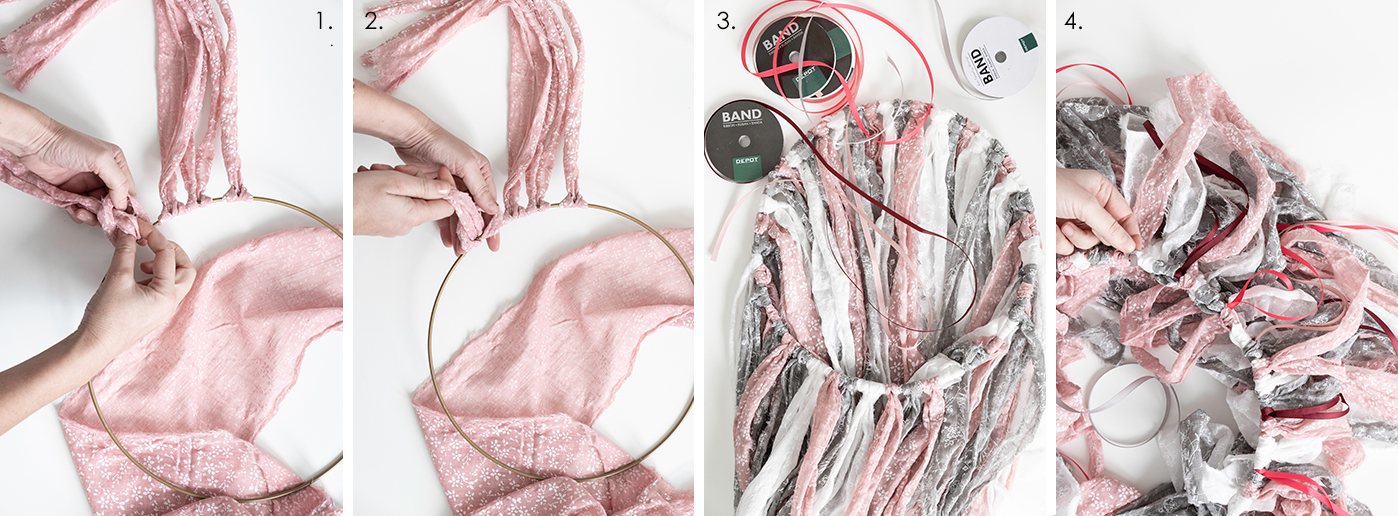 - Legt euch den Metallring bereit, meiner hat einen Durchmesser von 30 cm, und beginnt die Stoffstreifen um den Ring zu binden: Legt einen Stoffstreifen auf die Hälfte, so dass eine Schlaufe entsteht. Legt die Schlaufe unter den Metallring.
