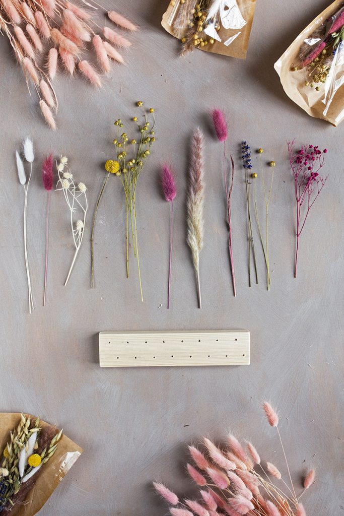 - Die Trockenblumen in den gebohrten Löchern arrangieren. Tipp: Besonders schön sieht es aus, wenn man in die hintere Reihe eher längere Stile aufreiht und in die vordere eher die kürzeren. Wenn Stile besonders dünn sind, diese einfach unten ein ganz kleines Stück umbiegen, sodass sie doppelt sind.