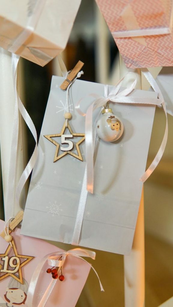 Damit die Mädchen später wissen, welche Tüten an welchem Tag geöffnet werden sollen, werden kleine Holzsterne mit Zahlen mit Hilfe von Klammern an die Tüten angebracht. Gleichzeitig dient die Klammer dazu, die kleinen Päckchen an das Satinband an den Treppensprossen zu fixieren.