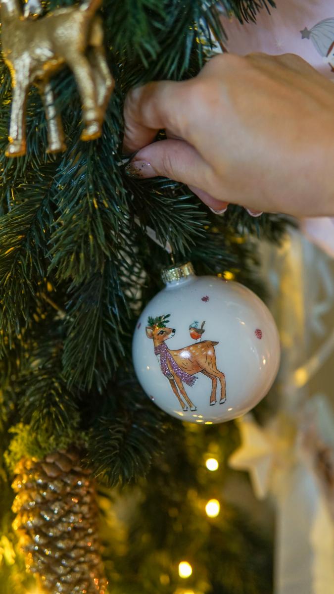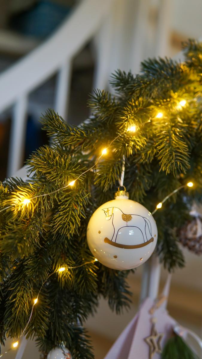 Sind die Lichterketten in der Tannengirlande versteckt, kann das Dekorieren beginnen. Dafür habe ich nicht nur Baumkugeln mit unterschiedlichen Motiven gewählt, sondern auch in unterschiedlichen Größen.