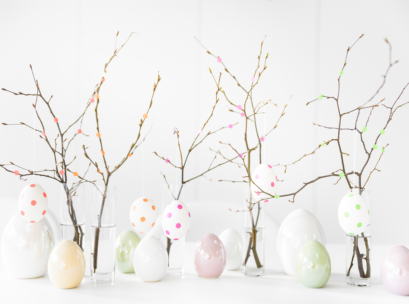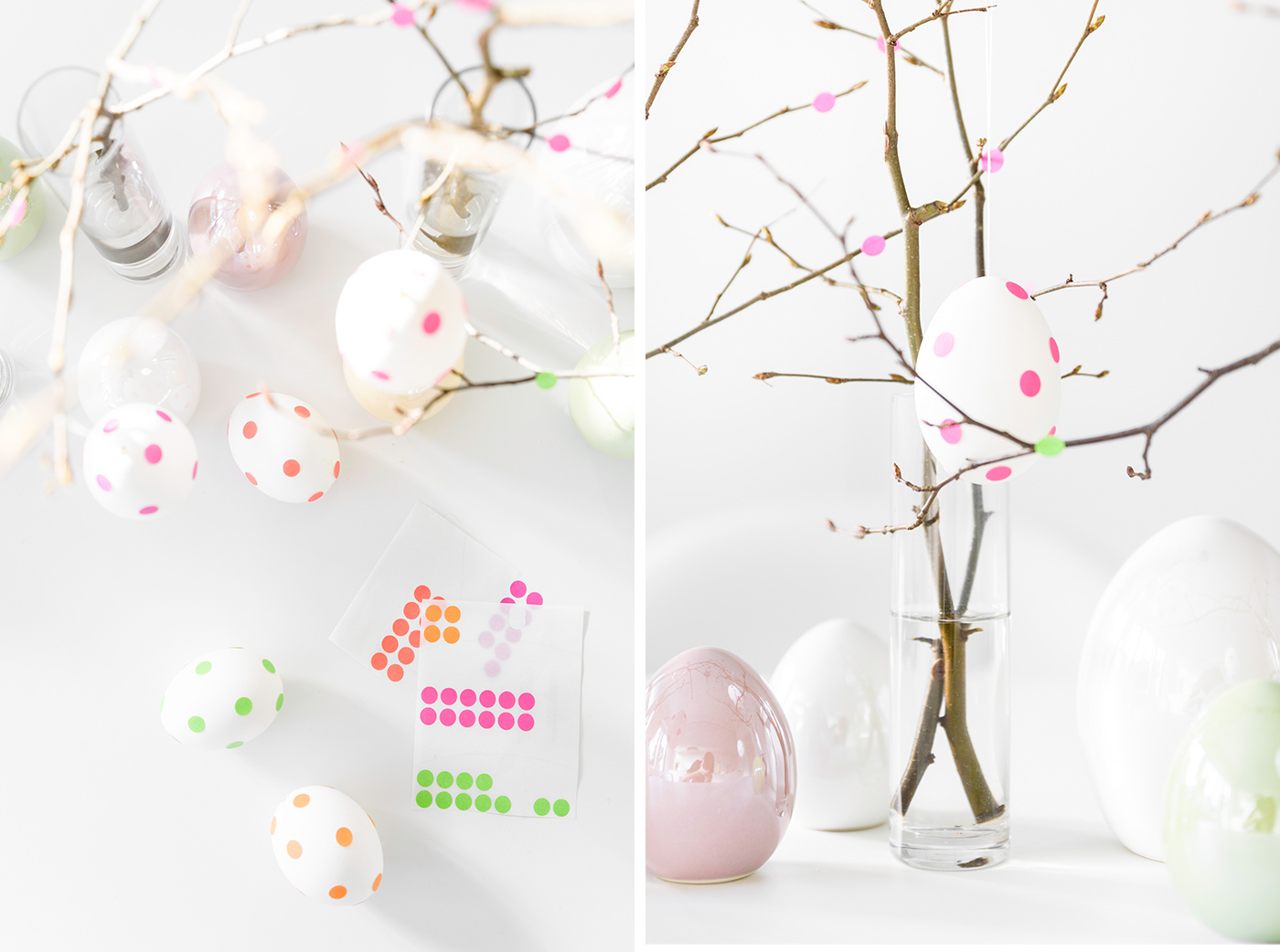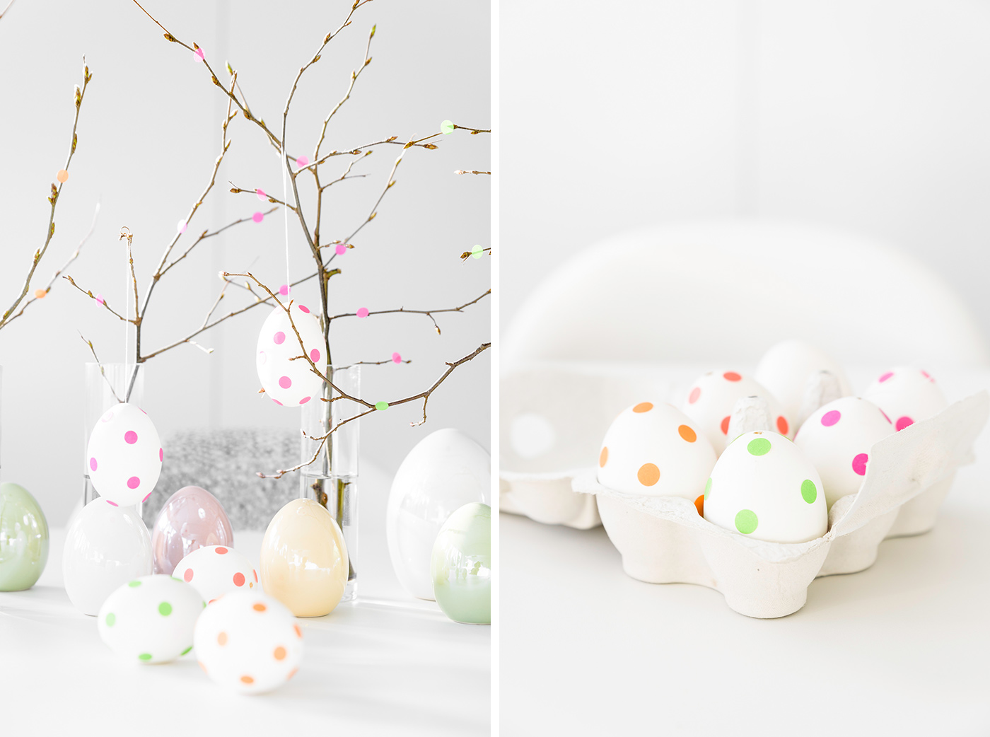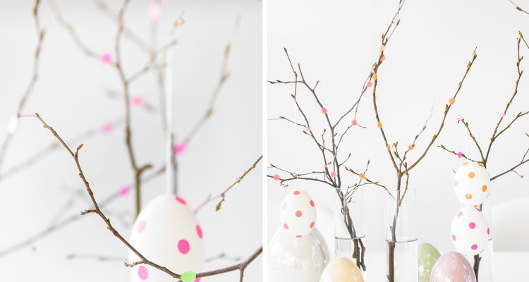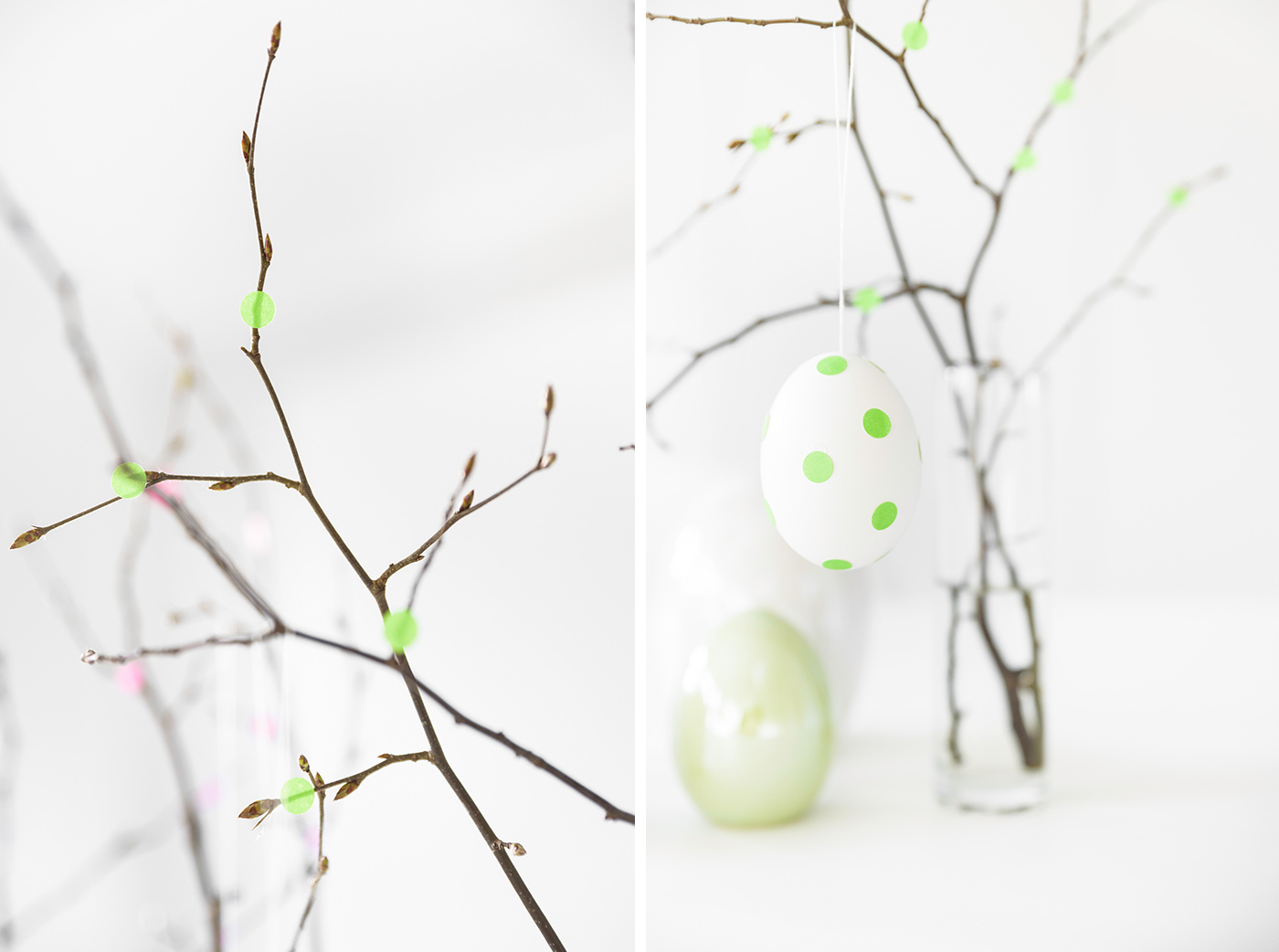 Ich habe meine Zweige für die Ostereier kurz geschnitten und auf schmale Zylindervasen verteilt. Da die Zweige nun doch sehr kahl aussahen, kam mir die Idee, der Natur unter die Arme zu greifen und sie mit bunten Klebepunkten zur verzieren. Voilà, farbenfrohe Blütenzweige sind entstanden und machen Lust auf mehr Farbe und auf mehr Polka-Dots.