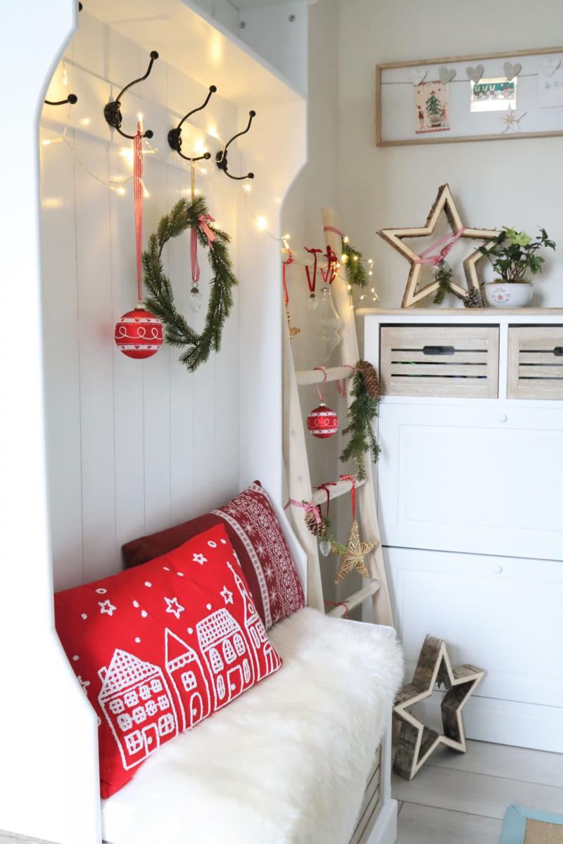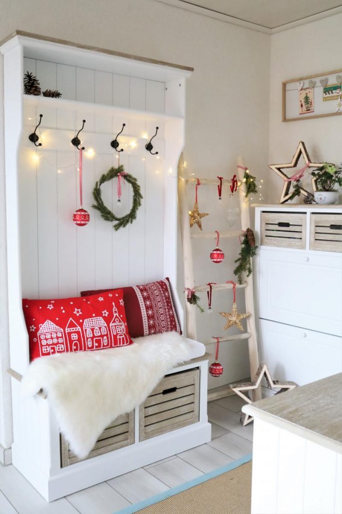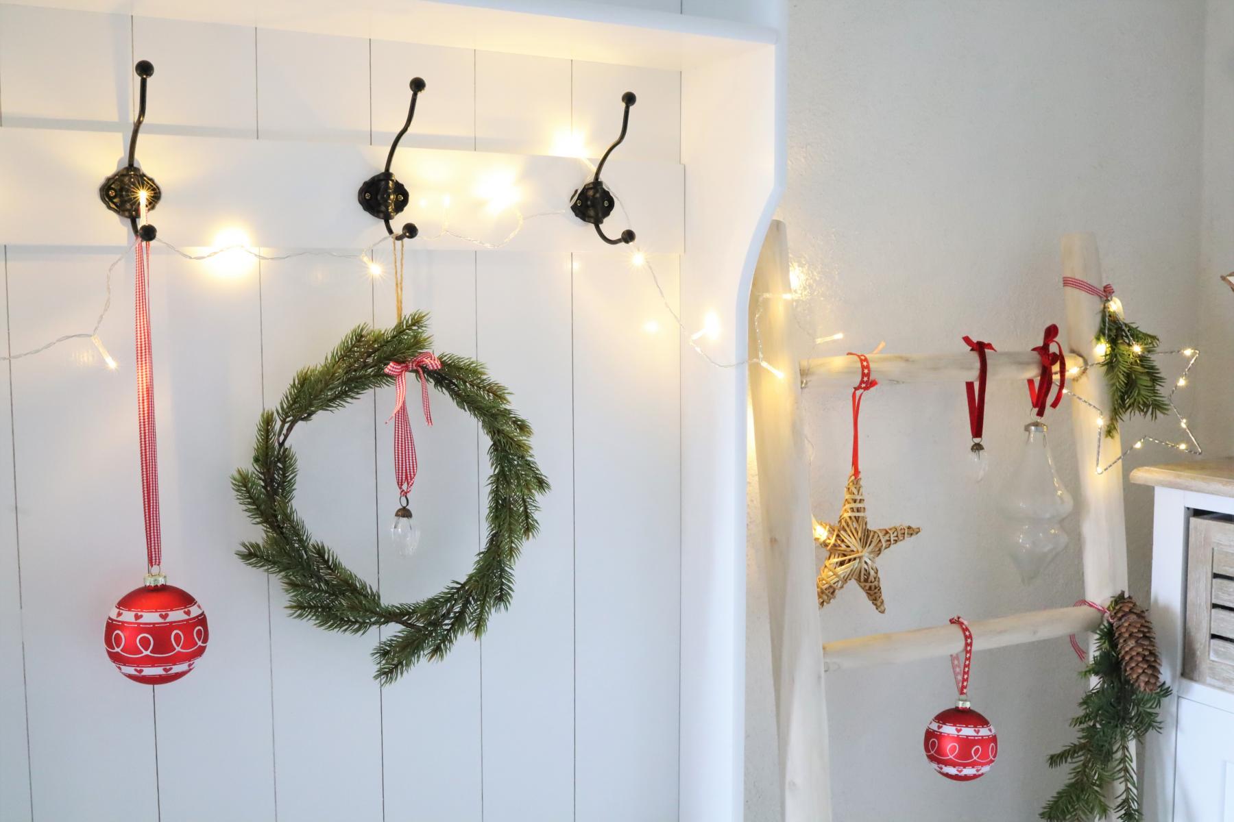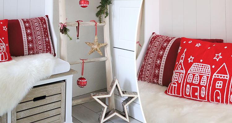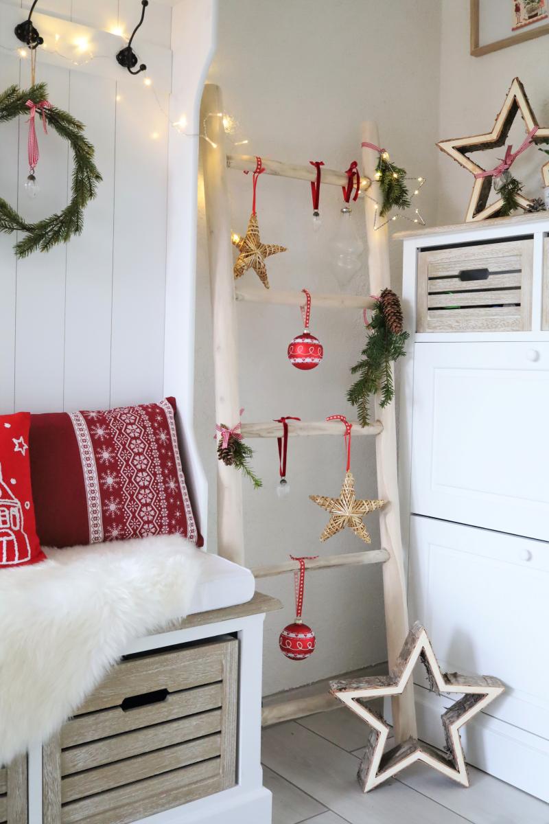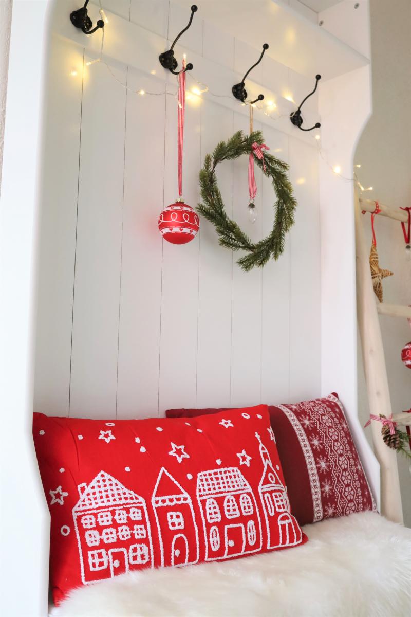 Auch die skandinavische Landhausgarderobe bekommt mit rot-weißer Kugel und Tannenkränzchen ein hübsches Weihnachtskleid. Nordisch gemütlich wird es durch ein weißes kuscheliges Kunstfell und rot-weiße Kissen mit nordischen Mustern. Eine Lichterkette sowie der schlichte LED-Drahtstern an der Holzleiter sorgen für Heimeligkeit, Geborgenheit, Wärme und besinnlichen weihnachtlichen Lichterglanz.