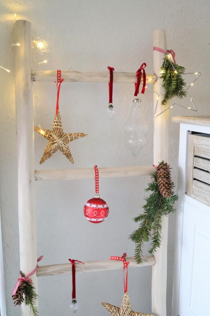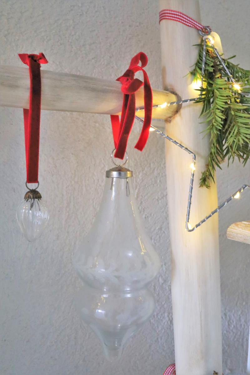 Für einen echten Blickfang im weihnachtlichen Eingangsbereich sorgt dieses Jahr die wunderschöne Holzleiter aus Treibholz. Ihr heller unbehandelter Naturton passt perfekt in mein nordisches Dekokonzept. Ich habe sie einfach an eine leere Wand gelehnt und mit rot-weißen Dekobändern an die Sprossen verschiedene weihnachtliche Deko-Objekte wie rot-weiße Kugeln, große und kleine Glas-Ornamente und Strohsterne gehängt. Rot-weiße Dekobänder sind für mich übrigens ab Herbst ein Deko-Must-Have, mit ihnen kann man u.a. einfache Weckgläser total schnell aufpeppen.