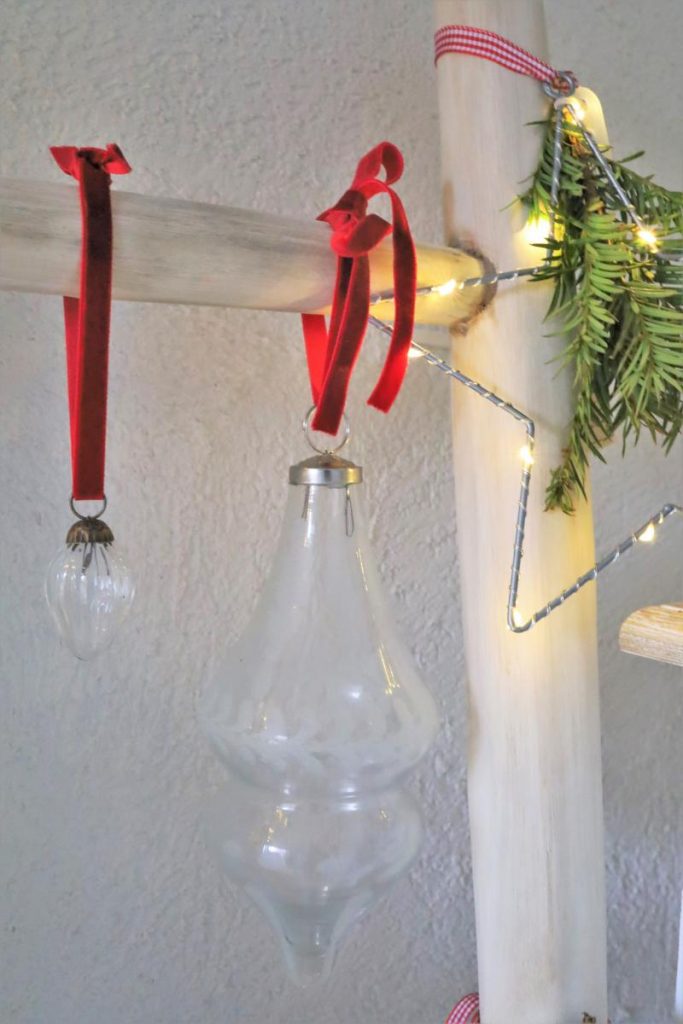 Toll dazu machen sich große Sterne aus Birkenholz, die sich schnell mit simplem rot-weißen Dekoband und kleinen Glas-Ornamenten verzieren lassen.