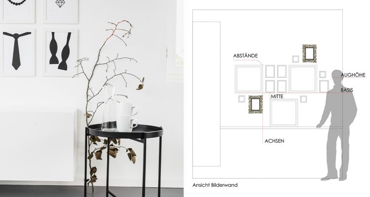 Bilder sind beliebte Dekoelemente, denn in den meisten Fällen gestalten wir unsere Wandbereiche doch mit Fotos, Grafiken oder sogar mit Gemälden. Erbstücke und Erinnerungsmomente sollen ins rechte Licht gerückt werden und die horizontale Fläche unsere Wohnräume schmücken. Es gibt unzählige Möglichkeiten, eine Fotowand zu gestalten oder eine Bildergalerie zu inszenieren. Allerdings ist das Thema „Bilderwand“ ein Wohnthema, welches viele Fragen aufwirft: Welche Anordnung gefällt mir? Wie plane ich überhaupt eine Fotowand und was kann ich dabei berücksichtigen? Wie hänge ich meine Bilderrahmen auf, wie nehme ich Maß? Welche Bilderrahmen passen zusammen? Genau um diese Fragen geht es heute. Ich habe Antworten und wertvolle Tipps für euch. Die Ideen und Anleitungen sind von mir grafisch aufbereitet, damit ihr eine visuelle Unterstützung zu den Beschreibungen habt.