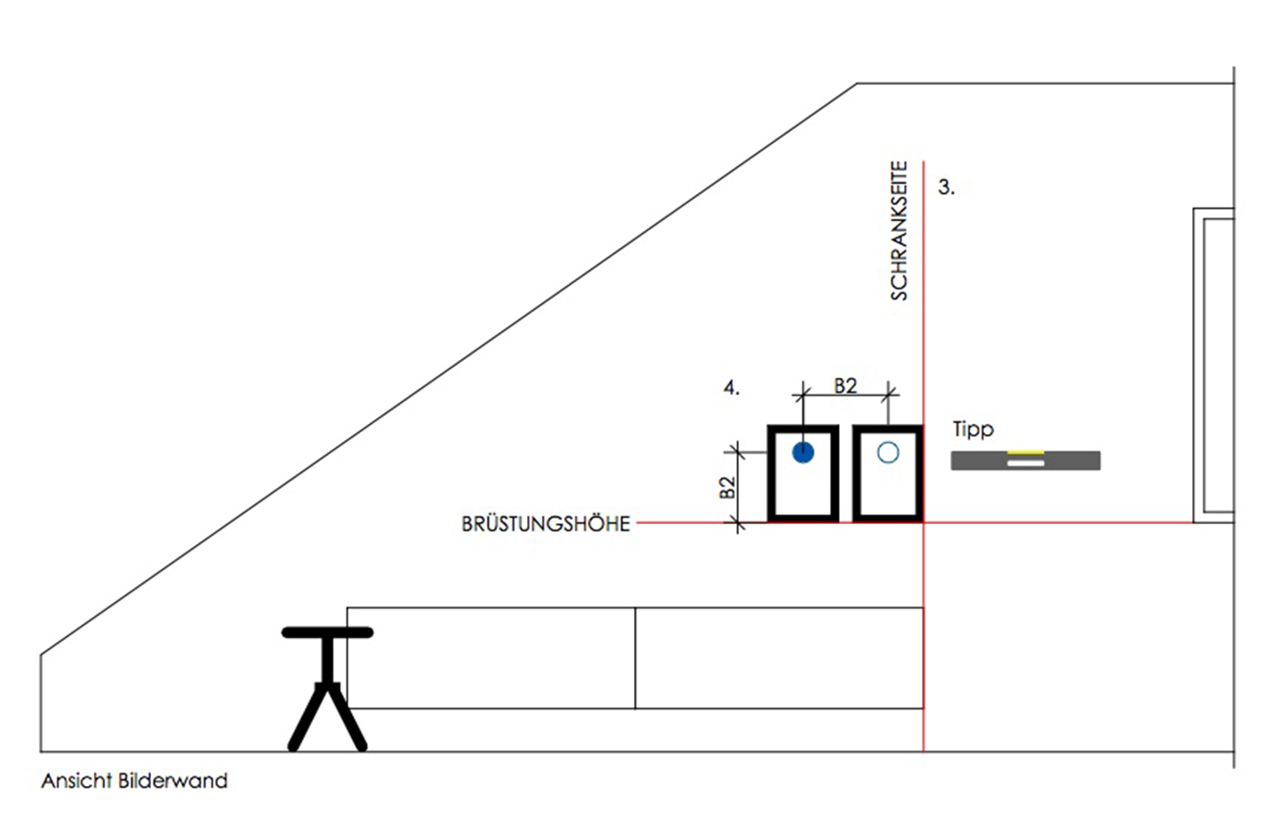Tipp: Markiert euch die seitlichen Bezugslinien (Brüstungshöhe und Schrankseite) mit Malerkrepp, verwendet auch hierfür eine Wasserwaage, damit die Linie gerade verläuft.