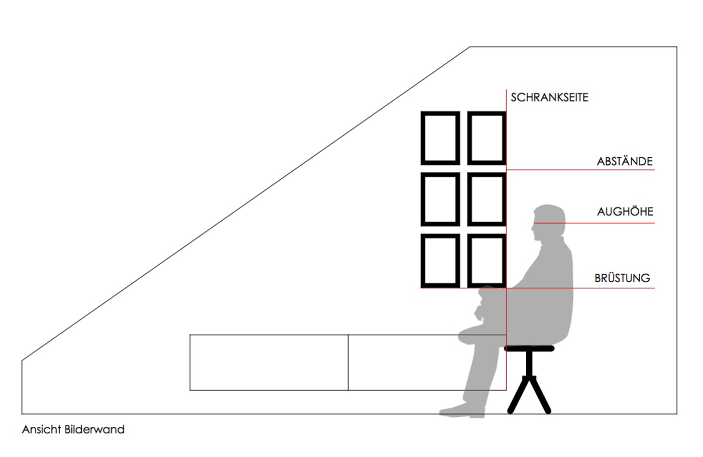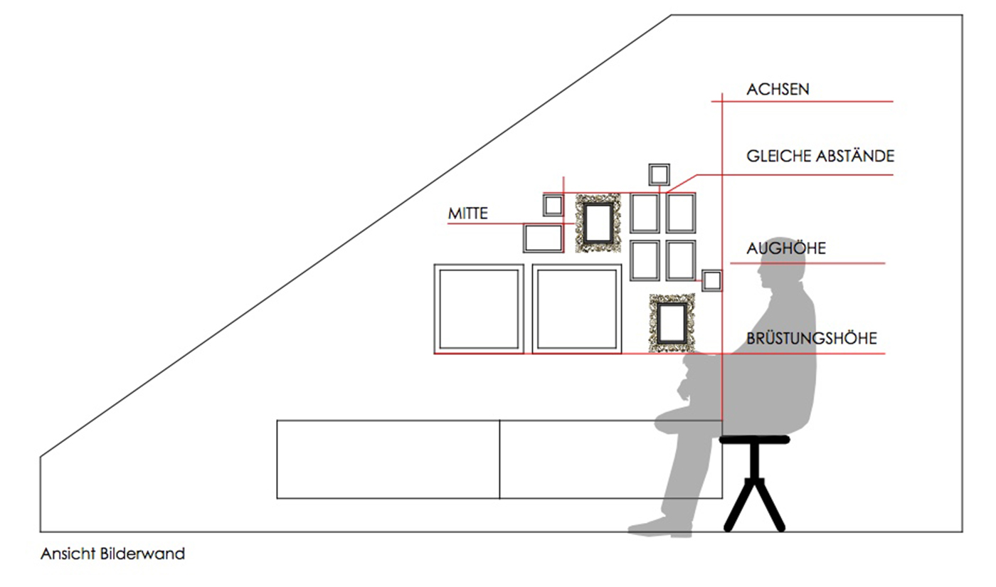 - Berücksichtigt die Aughöhe des Betrachters: Hängen die Bilder in der Nähe eines Sitzbereichs, fällt der Blick eher von sitzenden Personen auf die Bildfläche. Hängen die Bilder an Freiflächen, z.B. im Flur, wird die Aughöhe einer stehenden Person ausschlaggebend sein.