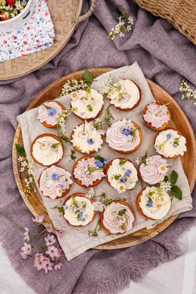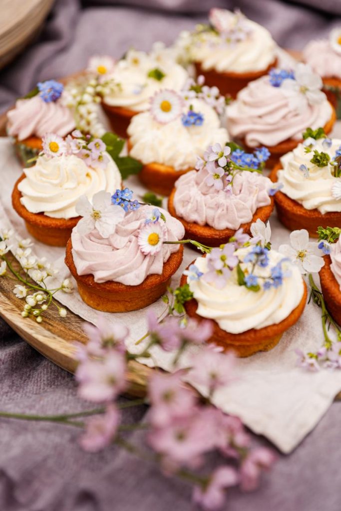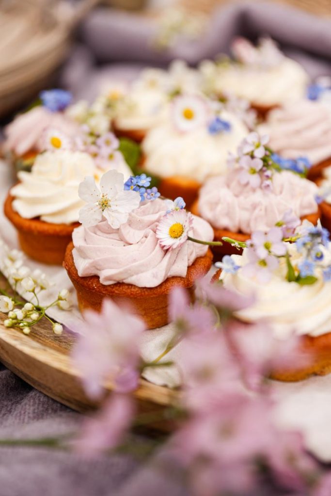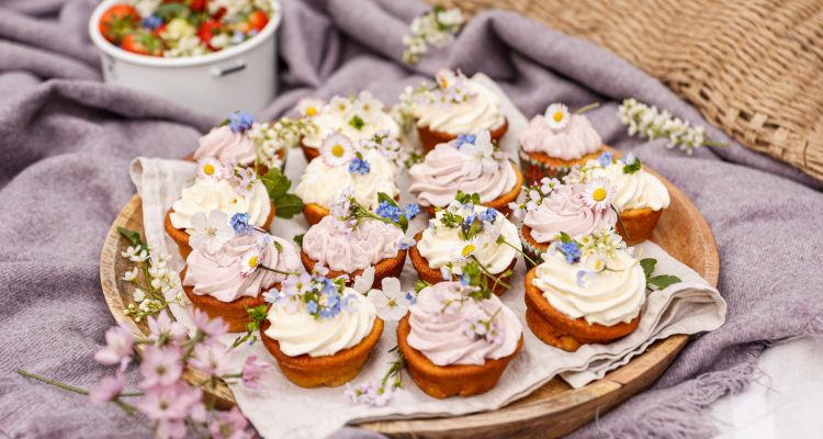 - Das Topping in einen Spritzbeutel mit großer Sterntülle füllen und hübsch auf die Muffins spritzen. Mit essbaren Blüten dekorieren.