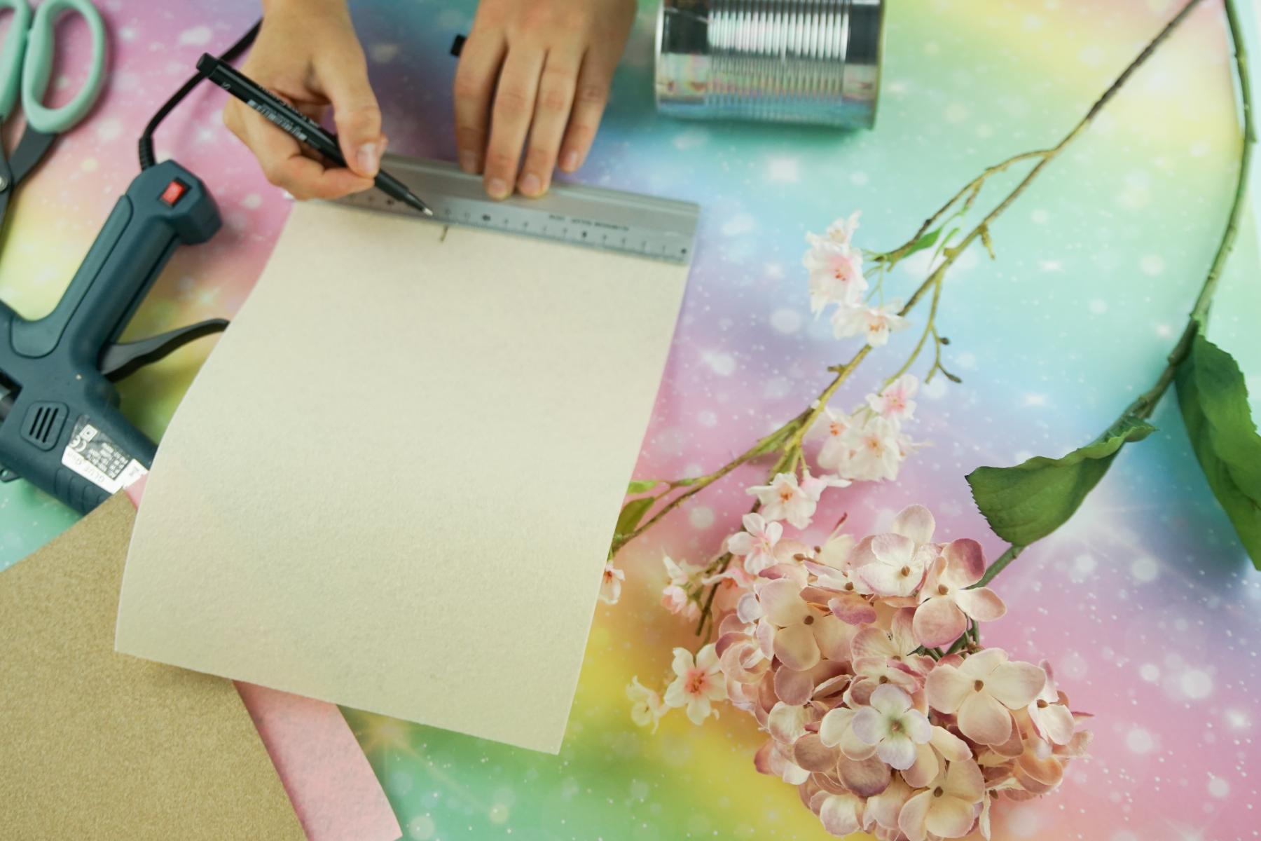 - Dann legen wir das Bastelfilz einmal um die Dose herum und markieren uns die Stelle, an der das Filz die Dose komplett bedeckt.