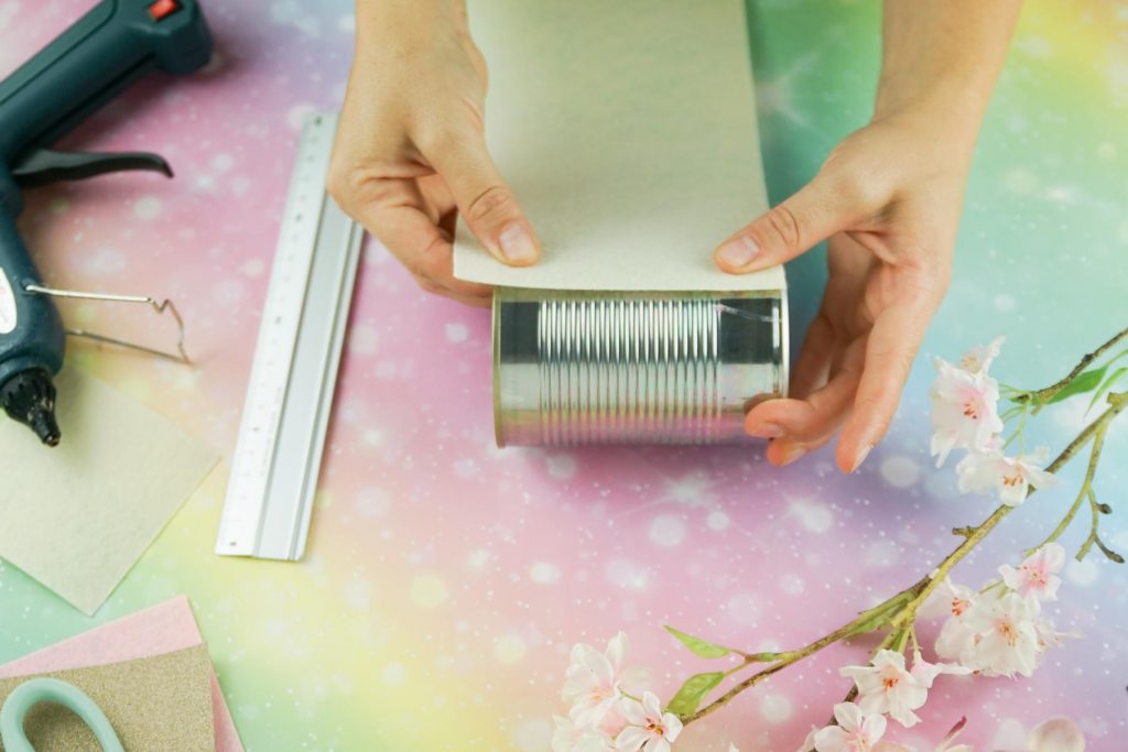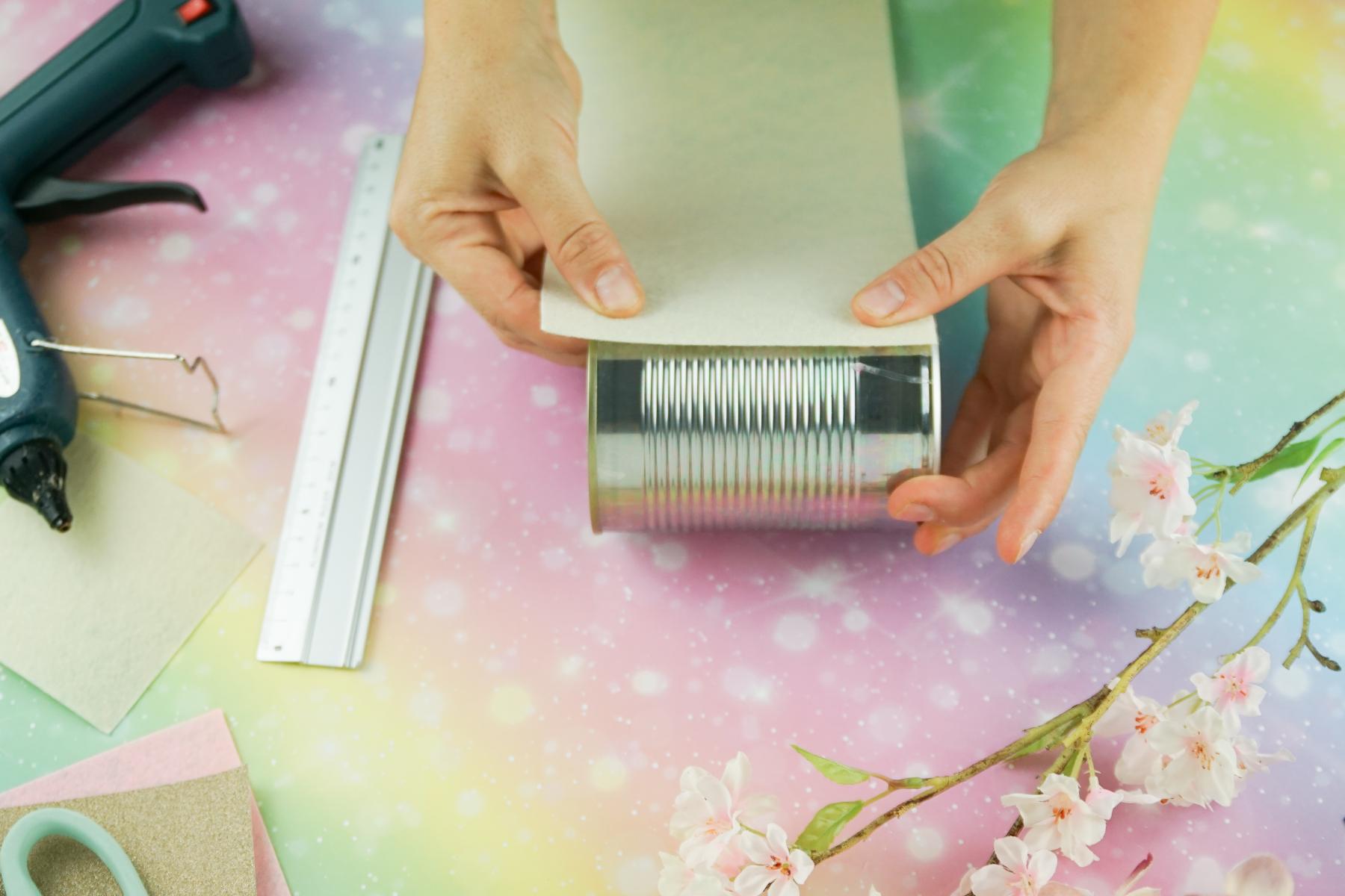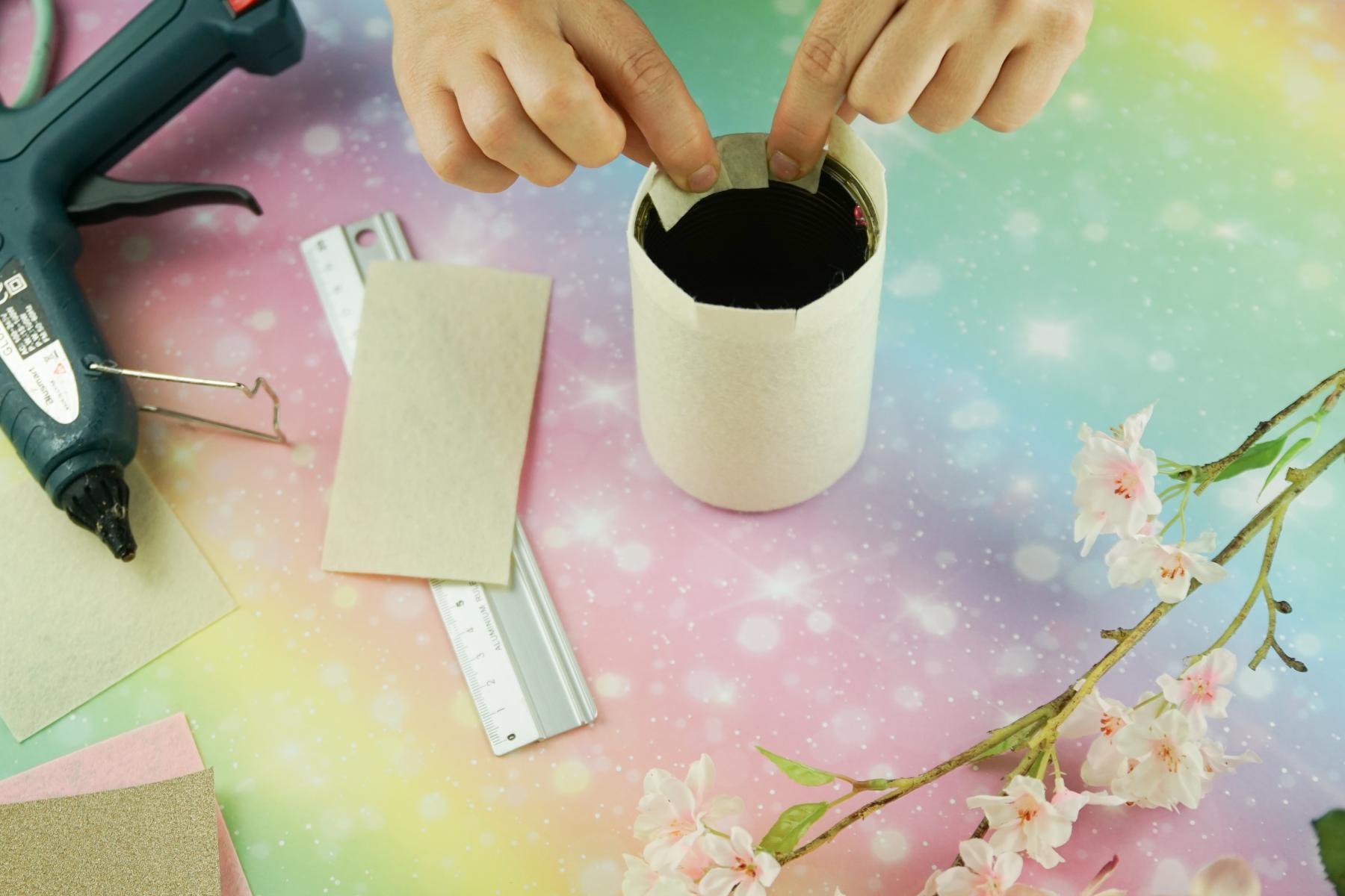- Jetzt kann das Bastelfilz zugeschnitten und mit der Heißklebepistole auf die Dose geklebt werden. Dabei wird der obere Rand etwas eingeschnitten und in die Dose geklebt, damit der eventuell scharfkantige Rand verdeckt ist.