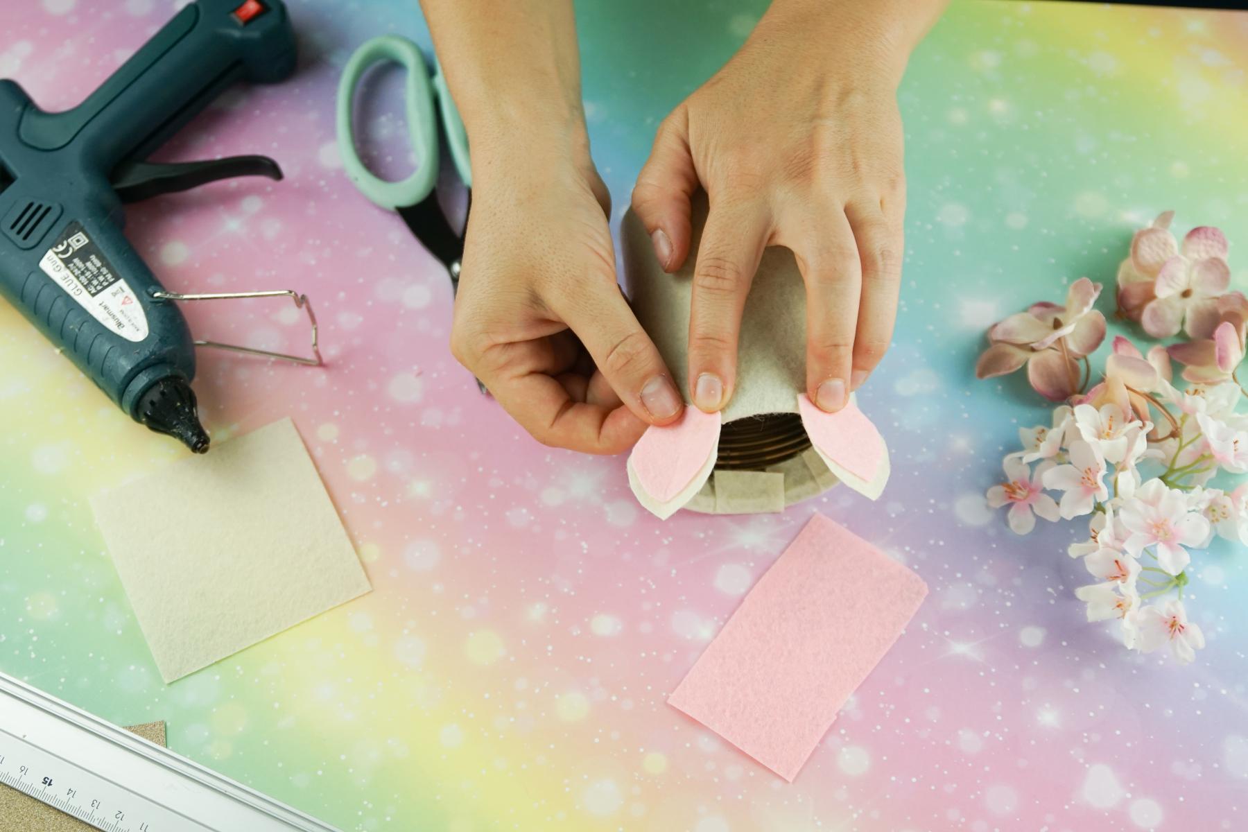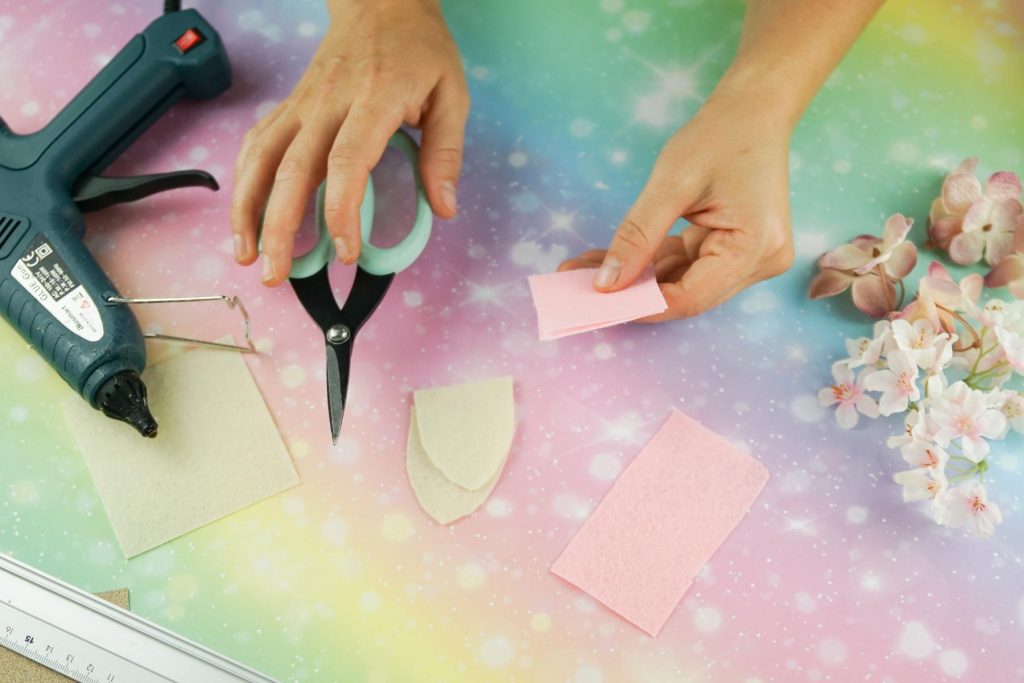 - Aus dem weißen Bastelfilz werden nun die Ohren rausgeschnitten. Aus dem rosa Bastelfilz schneiden wir kleinere Ohren aus und kleben dann „beide Ohren“ zusammen.