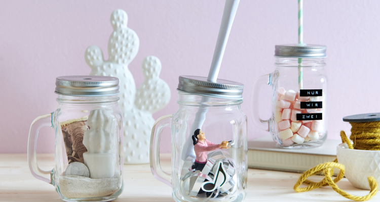 Ok, die Idee ist da, aber wie lasse ich den Gutschein jetzt dekorativ und besonders aussehen? In einem Briefumschlag soll er auf keinen Fall sein, das ist viel zu langweilig. Beim Nachmittagsputz in der Küche bin ich dann über meine Trinkgläser gefallen und hatte eine super Idee. Warum nicht das Thema des Gutscheins im Glas präsentieren?