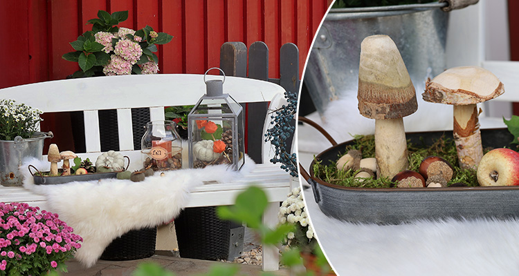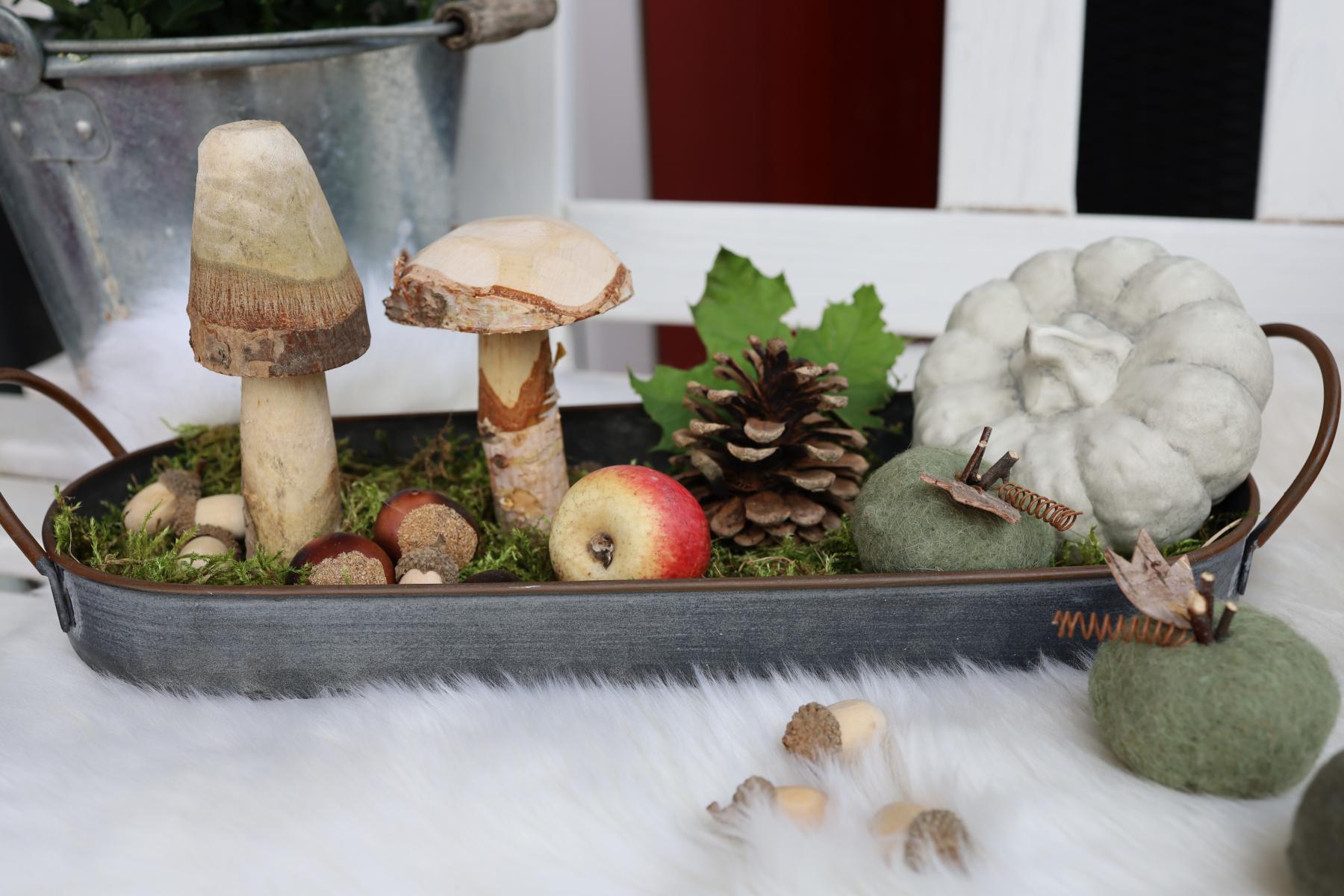 Ein weiterer Hingucker meiner herbstlichen Bank ist ein Dekotablett, dessen Boden ich zunächst mit Moos aus dem Garten ausgelegt habe. Auf dem weichen Moosbett fanden dann zwei Pilze aus Holz und ein Kürbis in Betonoptik Platz, sowie Eicheln und kleine Stoffpilze.