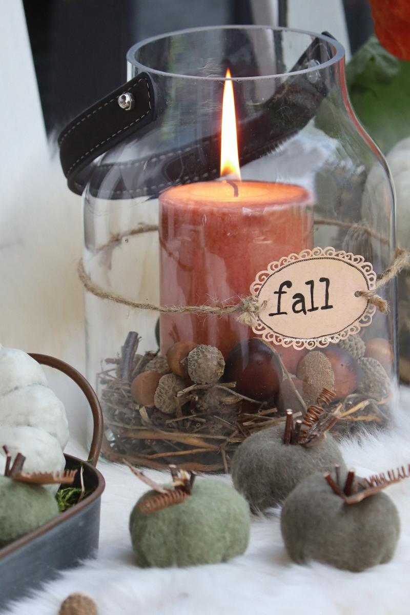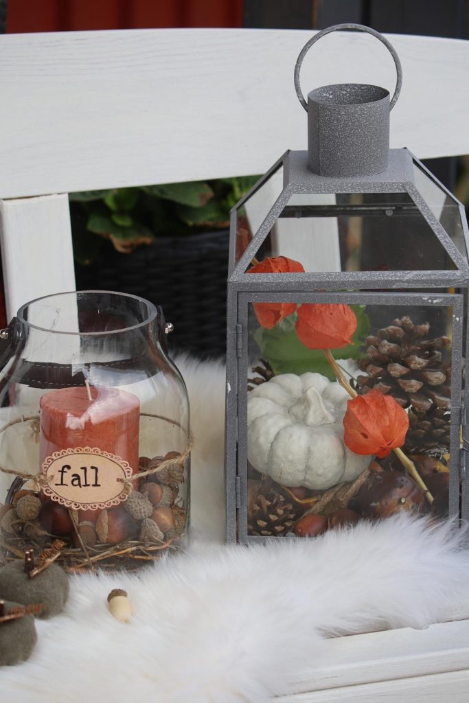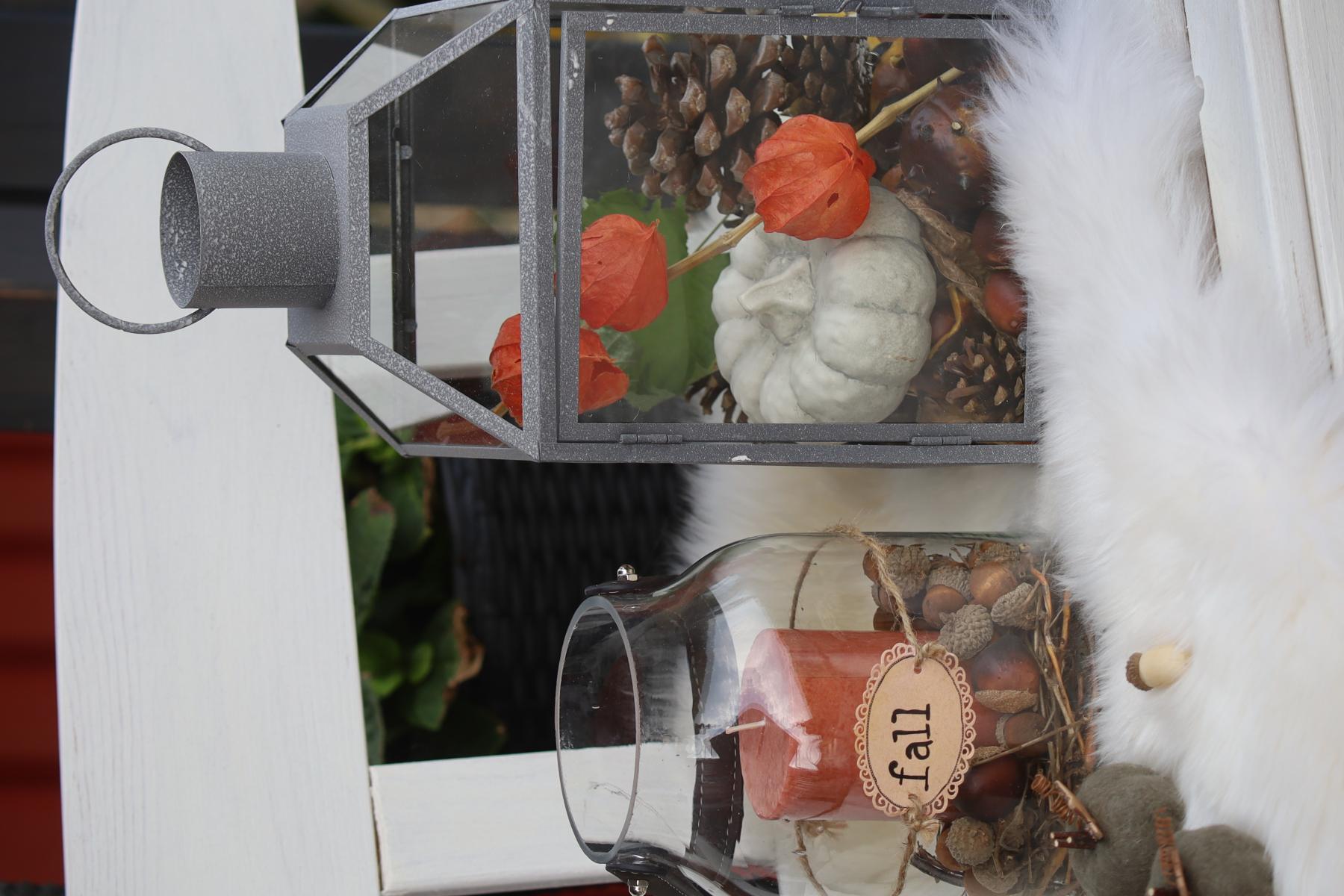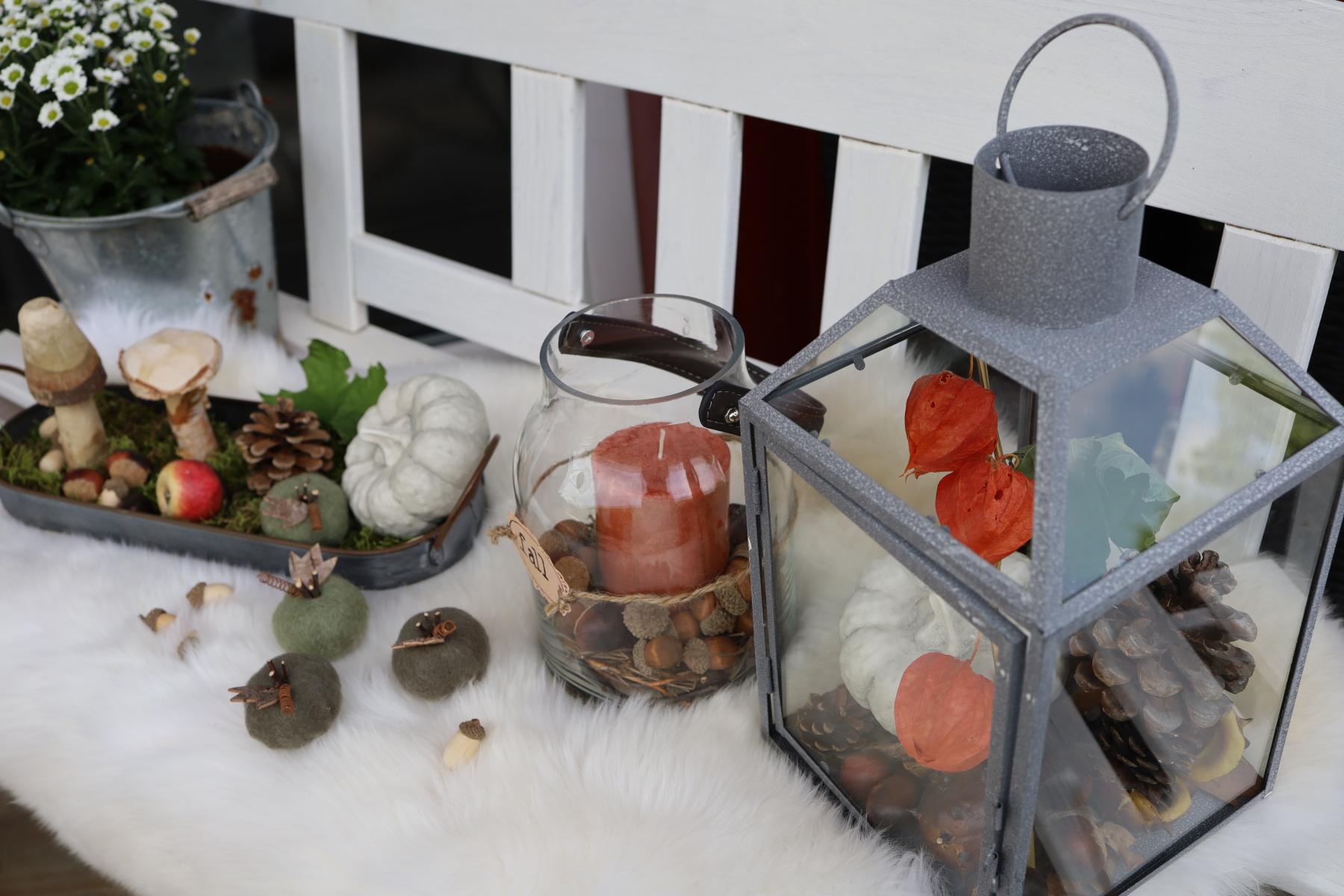 Kernstücke der dekorierten Bank sind ein Windlicht aus Glas und eine Laterne, die ich einfach mal etwas zweckentfremdet habe. Warum immer nur eine Kerze reinstellen, dachte ich mir, und habe beides kurzerhand mit Naturmaterialien befüllt. Äste, Eicheln, Zapfen, Kastanien, Kürbisse, Herbstlaub oder ein schöner Zweig der leuchtend orangen Physalis. Erlaubt ist alles was gefällt.