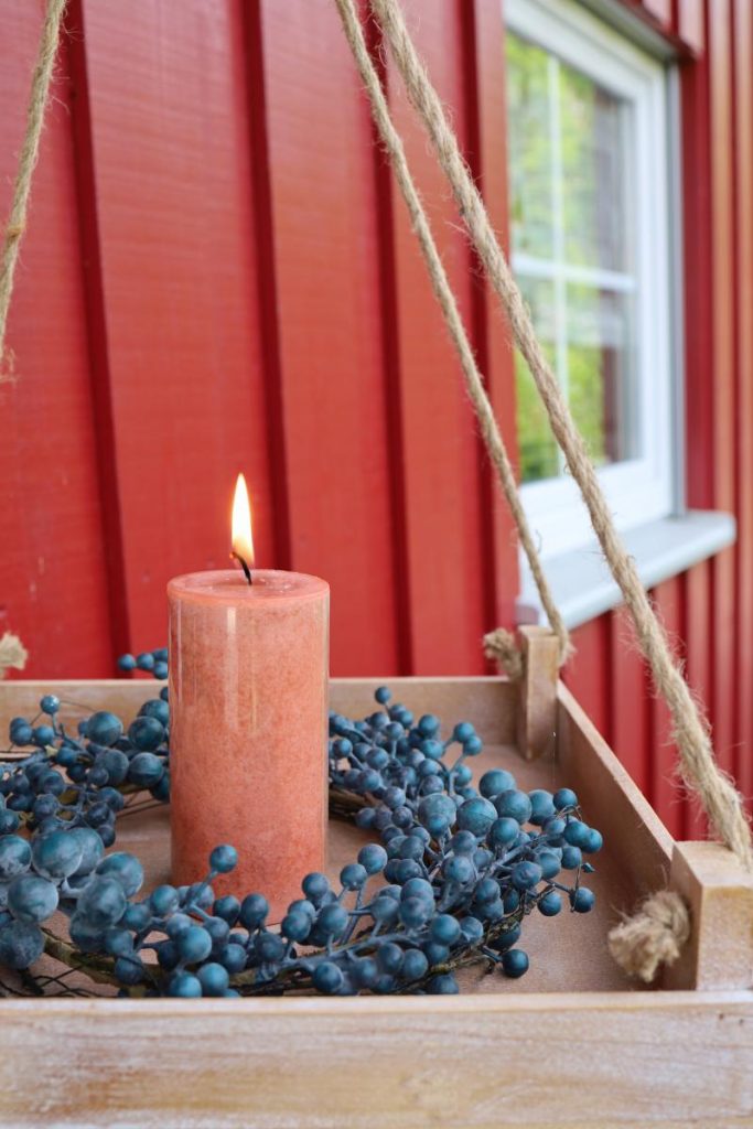 Diesen Landhauscharme habe ich abschließend noch einmal mit dem hölzernen Tablett aufgegriffen, das am Eisenhaken über der Bank die Deko-Ecke aufs schönste vervollständigt. Für den Herbst habe ich es einfach ganz schlicht mit einem Blaubeerkranz und einer Kerze dekoriert. Es war Liebe auf den ersten Blick, denn dieses Tablett ist ein wahrer Deko-Allrounder, der sich zu jeder Jahreszeit im Handumdrehen stimmungsvoll in Szene setzen lässt.