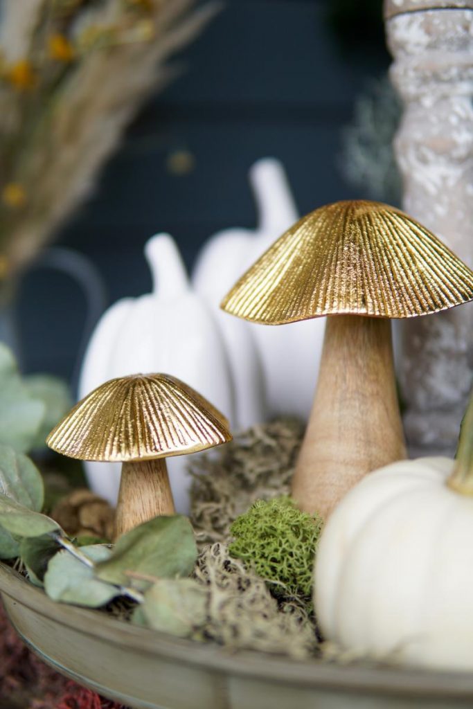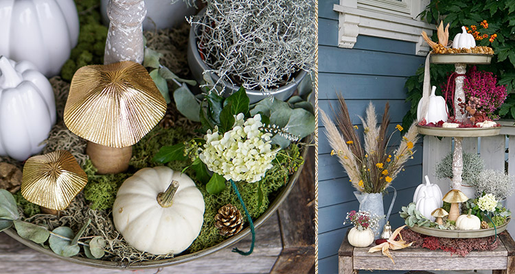 - Nun heißen eine Mischung aus echten Kürbissen und den edlen Porzellankürbissen in unterschiedlichen Größen unsere Gäste herzlich „Willkommen“. Die süßen Pilze mit den goldenen Hüten runden das Gesamtbild ab.
