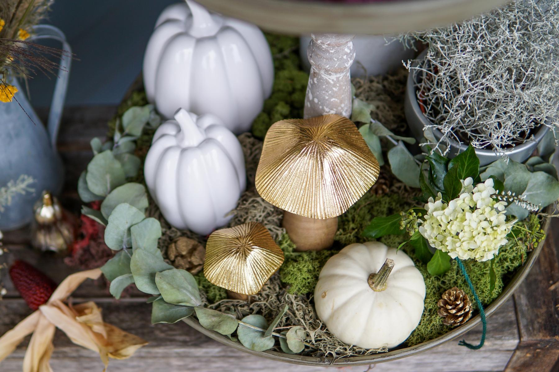 - Nun heißen eine Mischung aus echten Kürbissen und den edlen Porzellankürbissen in unterschiedlichen Größen unsere Gäste herzlich „Willkommen“. Die süßen Pilze mit den goldenen Hüten runden das Gesamtbild ab.