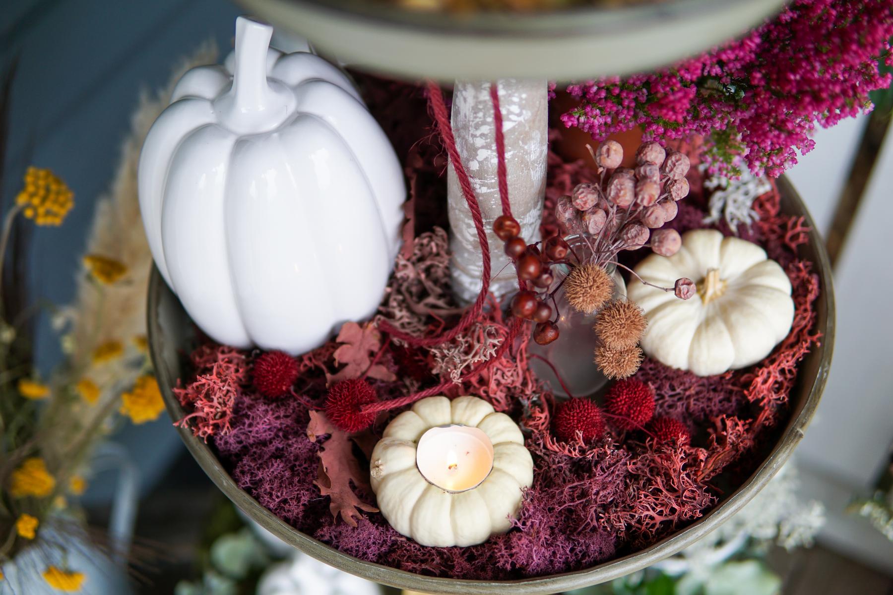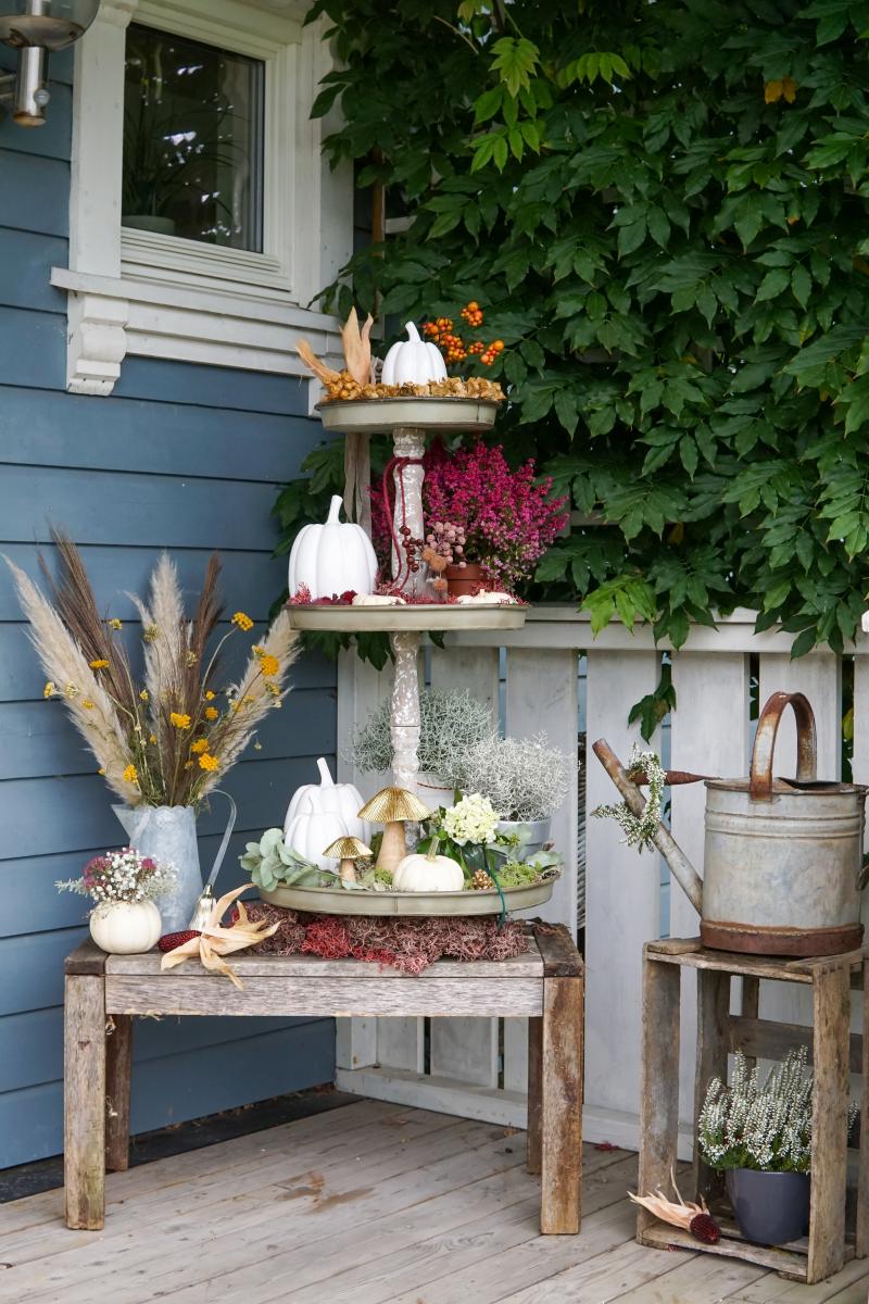 Da sich unsere Gäste noch bevor wir ihnen die Türe öffnen, „Willkommen“ fühlen sollen, wollte ich eine ganz besonders schöne Herbstdeko zaubern. Ein absolutes Must-have im Herbst sind natürlich Kürbisse, die ich dieses Jahr mit Besenheide, Stacheldrahtpflanzen, Flechten in verschiedenen Farben, Moos, Gräsern und mit Pilzen kombiniert habe. Um die Herbstdeko am Eingang besser zu arrangieren, habe ich mir eine Etagere als Hilfsmittel geholt. Durch die unterschiedlichen Bereiche der Etagere habe ich die Möglichkeit, die Deko besser zu „sortieren“ und dem Ganzen eine Struktur zu geben.
