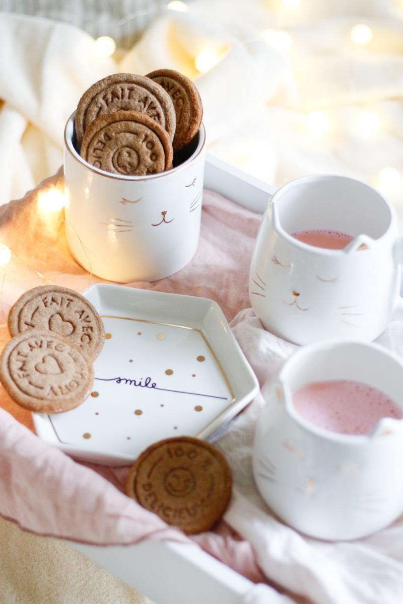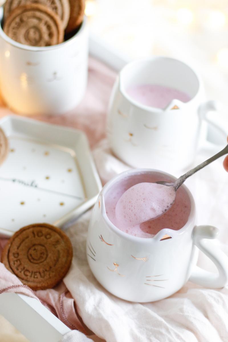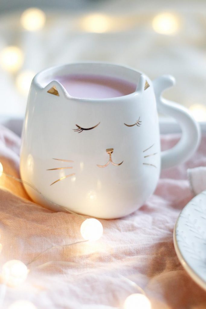 Der Geschmack ist angenehm süßlich und zusammen mit etwas gemahlener Vanille und Zimt schmeckt sie einfach nur köstlich. Ich schäume mir die Milch immer gerne heiß auf, einfach weil ich Milchschaum löffeln liebe, aber ihr könnt die Milch natürlich auch ganz einfach nur im Topf erhitzen. Wir schlürfen unsere ‚Unicorn Hot Chocolate‘ aus den zuckersüßen Henkelbechern mit Katzenöhrchen und süßem Katzengesicht und kuscheln uns dabei wie eine Schmusekatze mit unserer Kuscheldecke ins Bett.