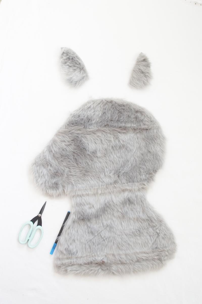 - Schritt: Vor dem Befestigen der Ohren habe ich die Klebefläche vom Fell befreit.