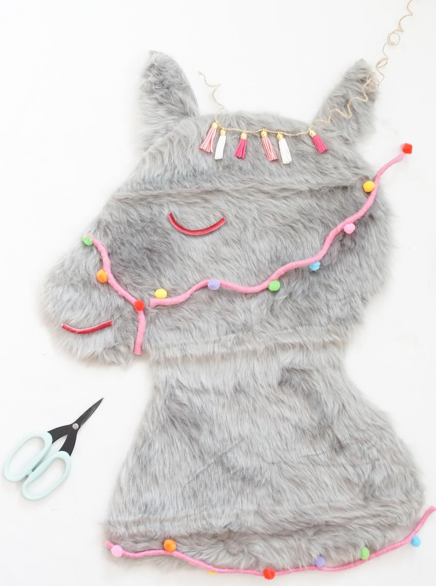- Schritt: Nun geht es an die Dekoration des Kopfes. Aus dem Band sind der Mund und die Augen entstanden. Die Quasten können als „Pony“ dienen. Aus dem PomPom Band habe ich das Geschirr für das Lama zurecht geschnitten. Bist Du zufrieden mit der Dekoration? Dann kann es losgehen mit dem Kleben.