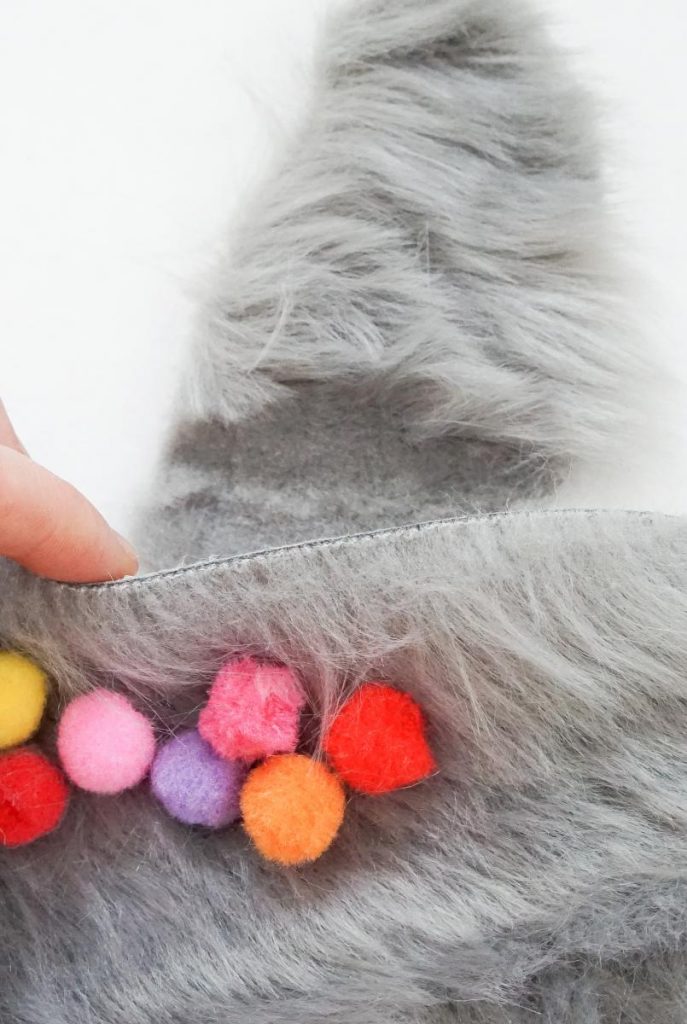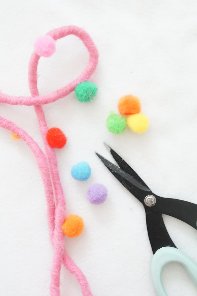 - Schritt: Bevor ich angefangen habe zu kleben, ist mir noch eine Idee gekommen: Ich habe die Pompoms von dem Band vorsichtig abgeschnitten und diese statt den Quasten verwendet. Das überlasse ich aber deinem Geschmack und deiner Fantasie.