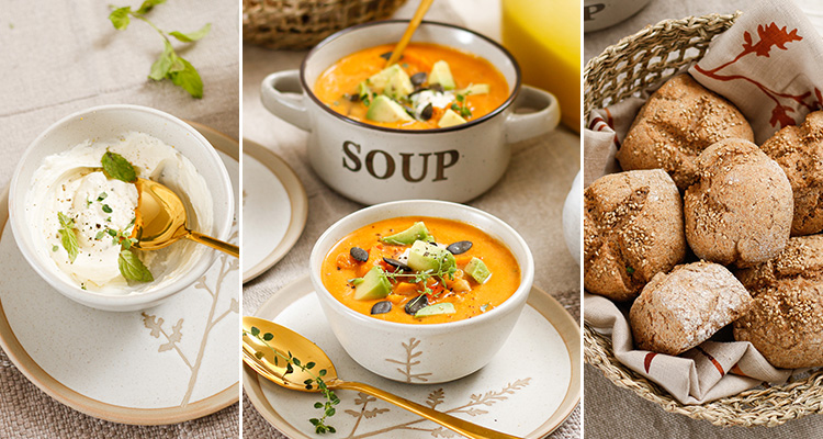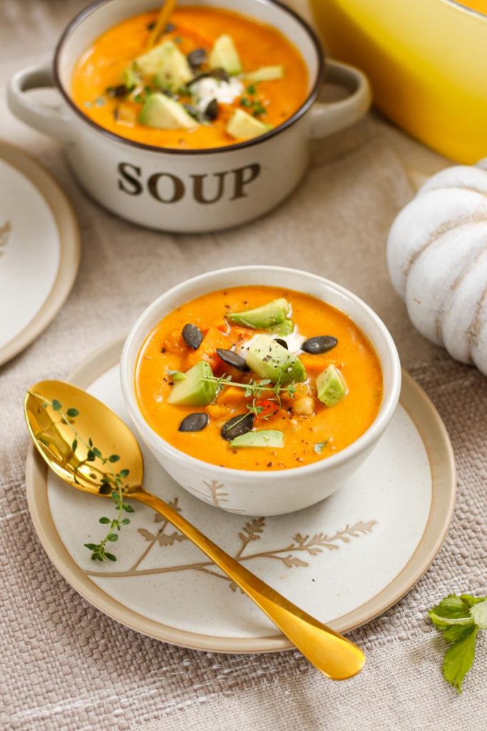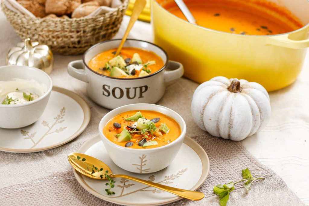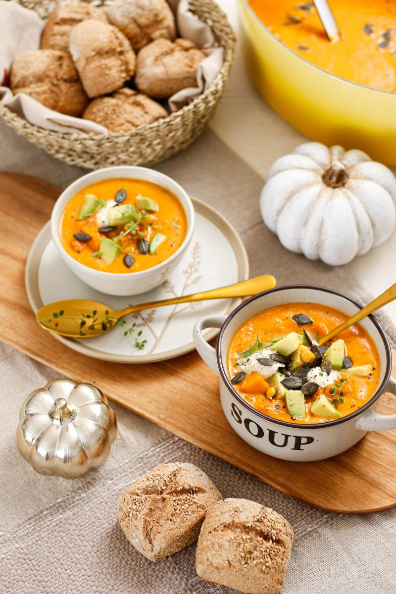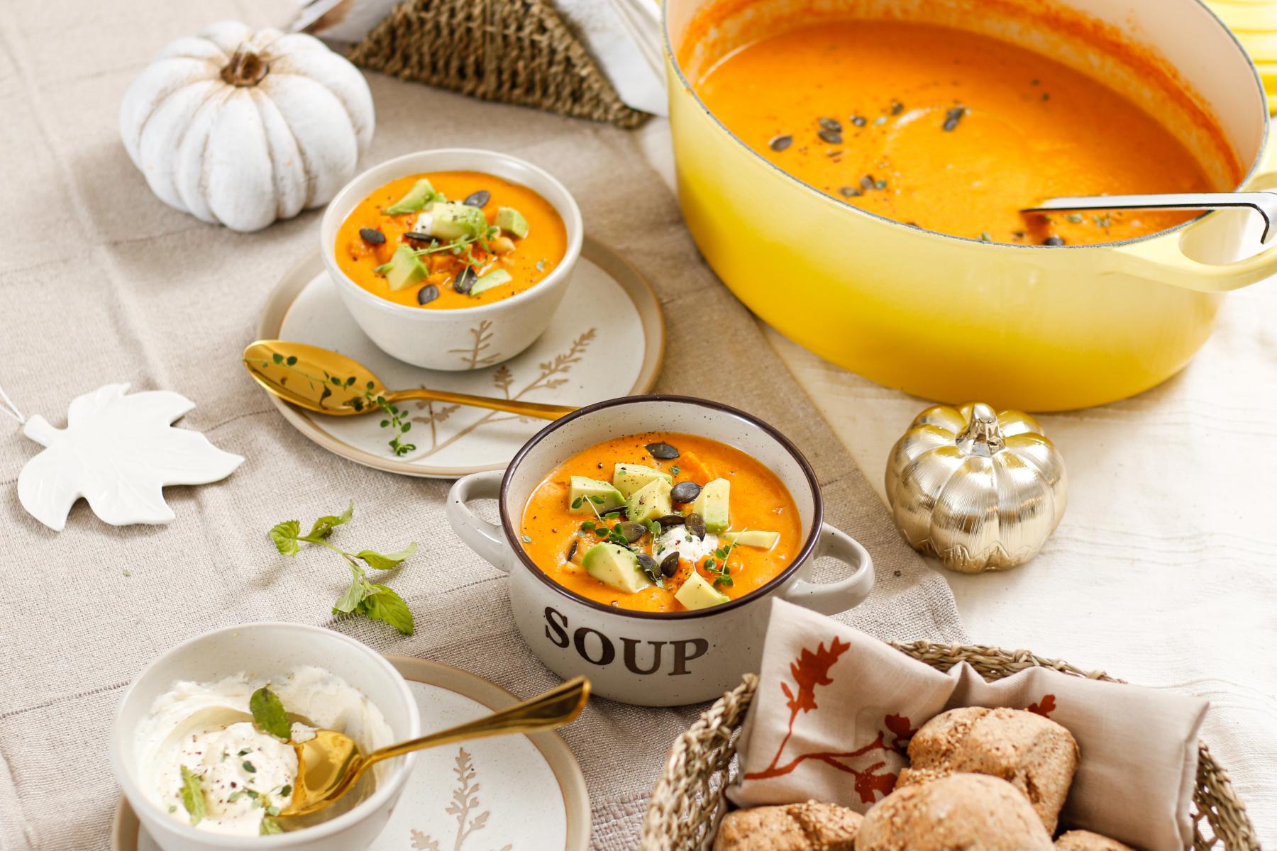 Mit den hübschen Suppenschalen und den Deko-Kürbissen bringen wir ganz schnell herbstliche Stimmung auf unseren Esstisch. Diese heiße Supersuppe mit köstlicher Einlage wärmt schön von innen und schmeckt einfach göttlich. Sie schmeckt leicht süßlich, herrlich aromatisch und frisch. Also los, schnappt euch den schönsten Kürbis, den ihr finden könnt und macht es euch gemütlich.
