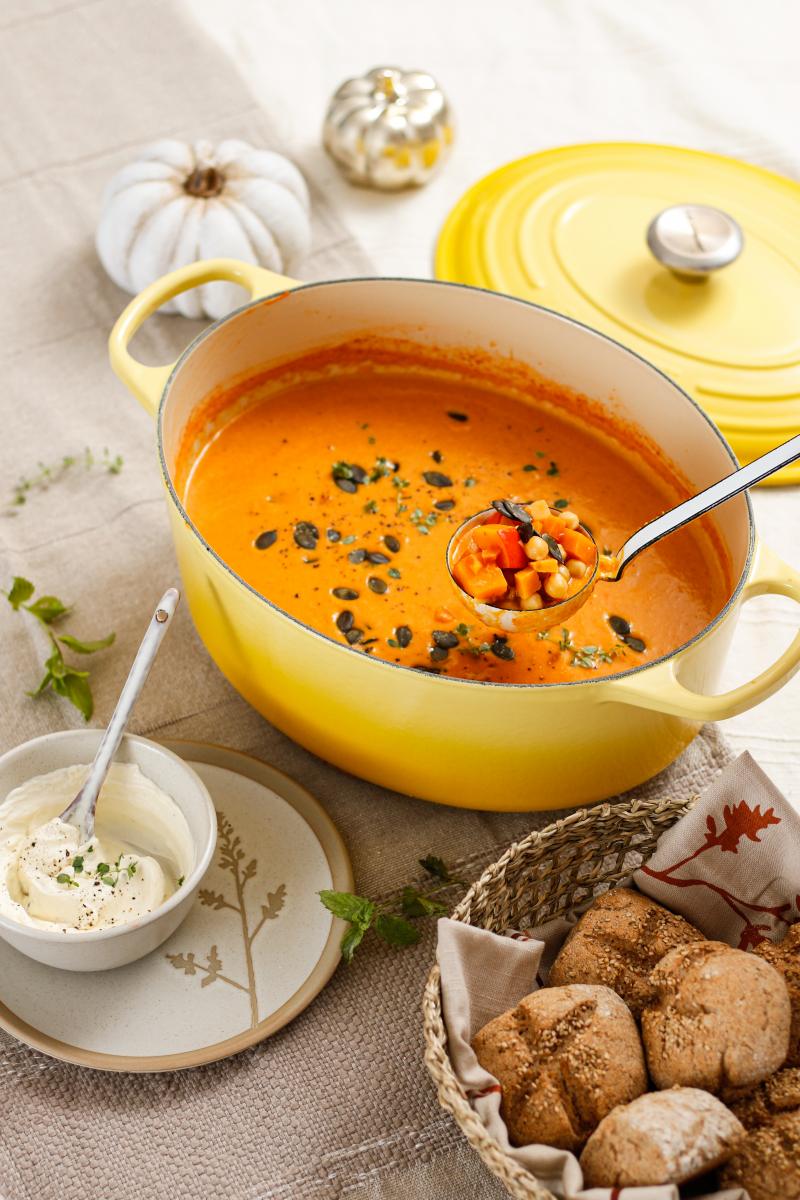 Allein die knallig orange Farbe macht hier schon richtig gute Laune. Oder was meint ihr? Da kann man doch einfach nicht Nein sagen. Zu diesem himmlischen Veggie-Eintopfrezept gibt es unschlagbar schöne Herbst-Deko und Geschirr in warmen Naturtönen. Wenn die Abende also allmählich kühler werden, darf es dafür auf dem Tisch wieder etwas wärmer und rustikaler zugehen. Wir wollen es richtig gemütlich und heimelig haben.