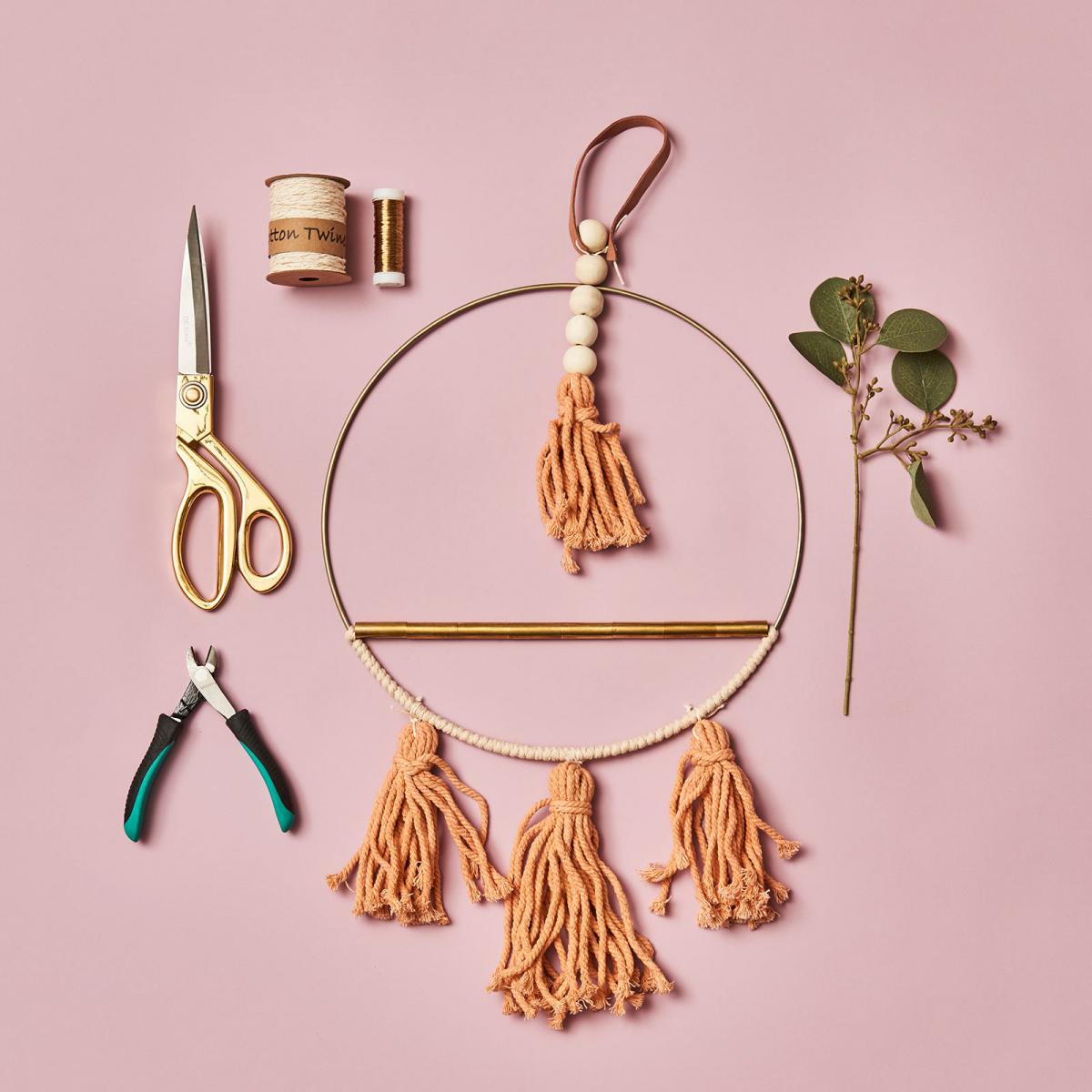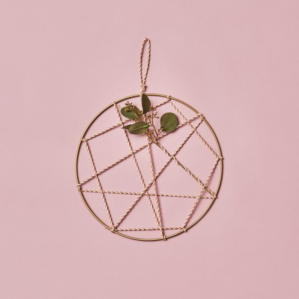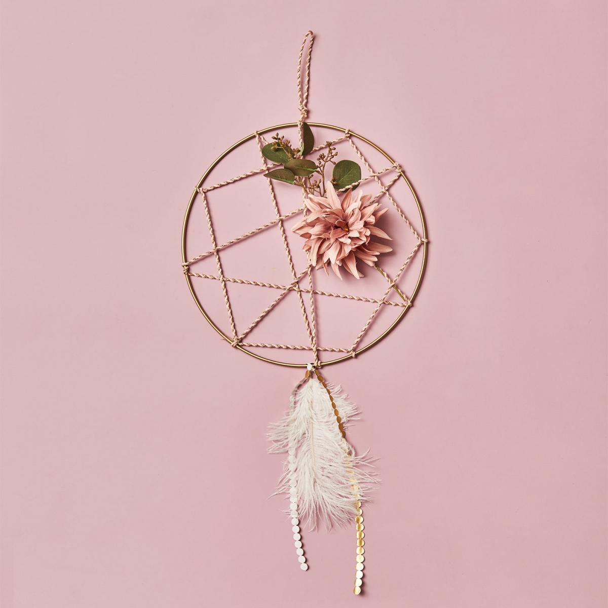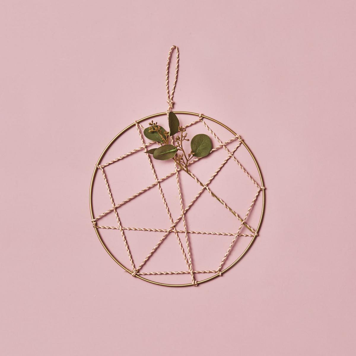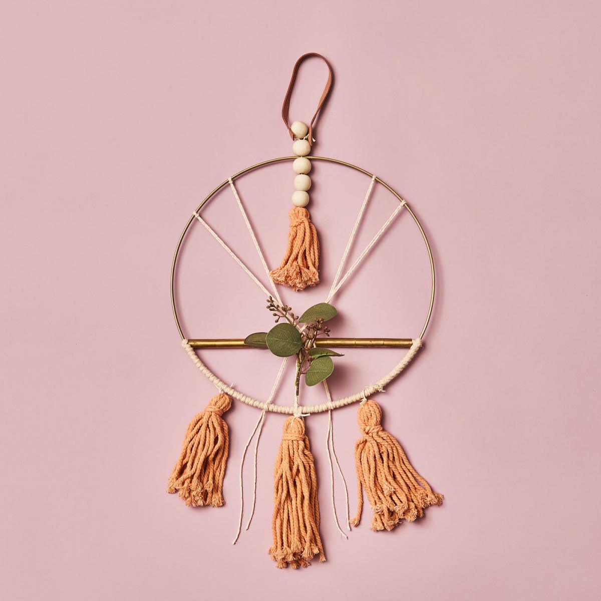 - Da unser Dekoanhänger bereits tolle pfirsichfarbenden Quasten besitzt, lässt sich damit super schnell ein Traumfänger selber machen. Schneide im erstem Schritt den Eukalyptusstiel ab und binde die Blätter mit Draht an der goldenen Mittelstange des Traumfängers fest.